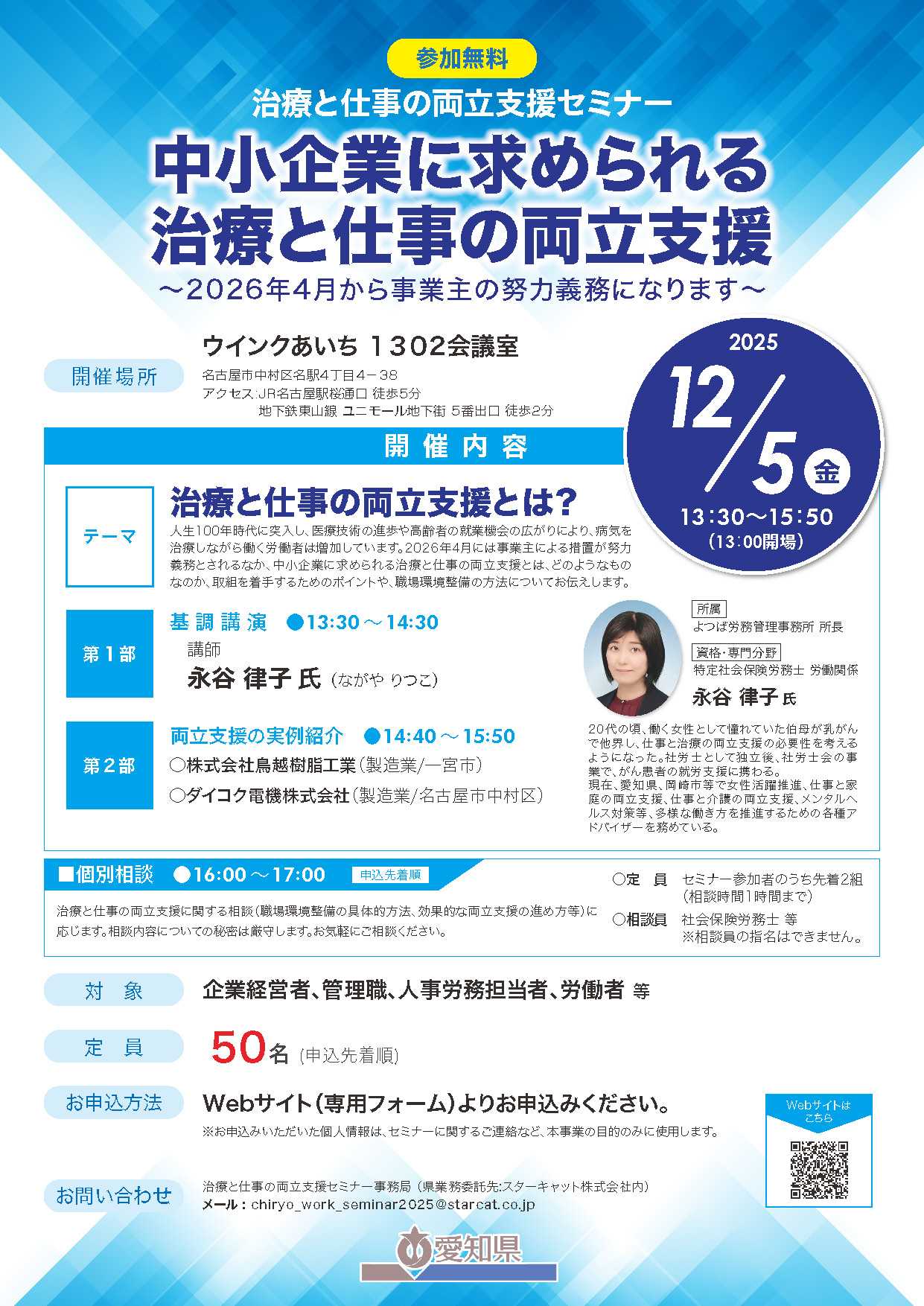 愛知県では、病気治療を続けながら働く社員を支える「治療と仕事の両立支援」の理解を深めるため、専門家や企業の実践事例を紹介するセミナーを開催します。📅 日時:2025年12月5日(金)13:30~15:50(個別相談16:00~17:00)📍 会場:ウインクあいち 1302会議室(名古屋市中村区)👥 対象:企業経営者・管理職・人事労務担当者 等🎫 定員:50名(申込先着順)💡 参加無料🔸基調講演:「治療と仕事の両立支援とは?」 講師:永谷律子 氏(よつば労務管理事務所 所長/特定社会保険労務士)🔸実践事例紹介: ・株式会社鳥越樹脂工業(製造業/一宮市) ・ダイコク電機株式会社(製造業/名古屋市)🔸個別相談: 社会保険労務士などの専門家が、貴社の課題に応じてアドバイスします。👉 詳細・申込はこちら:https://www.pref.aichi.jp/press-release/chiryoutoshigoto07.html
