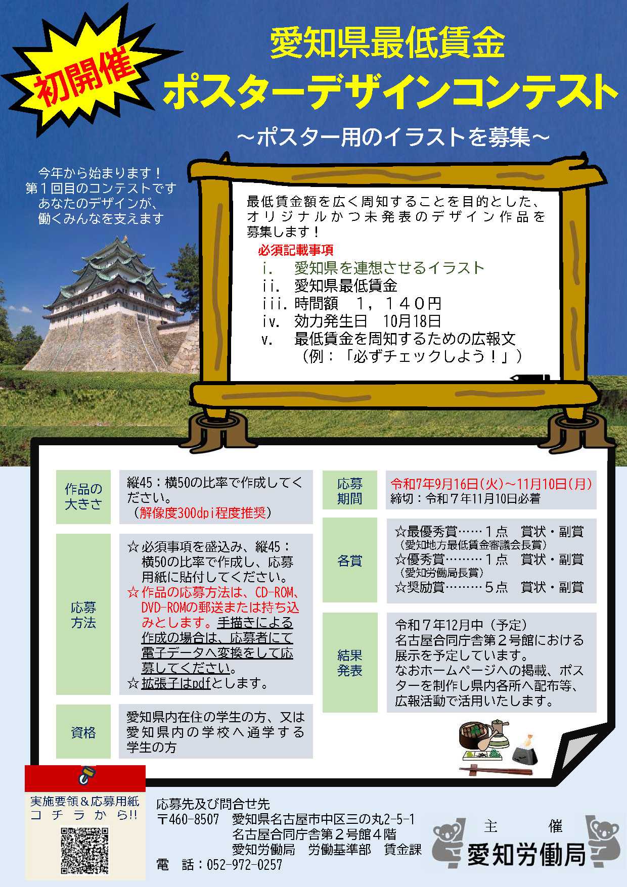 愛知労働局では、最低賃金(時間額1,140円/令和7年10月18日発効)を広く県内に周知するため、学生の皆さんからオリジナルデザインを募集しています。📌作品の中には、以下の要素を必ず入れてください:・愛知県を連想させるイラスト・「愛知県最低賃金」・「1,140円」・「10月18日」・周知メッセージ(例:「必ずチェックしよう!」)🖼制作比率:縦45×横50(300dpi程度推奨)📄提出形式:PDF🎓応募資格:愛知県内在住・在学の学生🗓締切:令和7年11月10日(月)必着🏆入賞作品は名古屋合同庁舎で展示され、実際に県内で掲示予定!あなたのデザインが、働く人を支えるメッセージに✨📞問合せ:愛知労働局 賃金室(052-972-0257)📍〒460-8507 名古屋市中区三の丸2-5-1 名古屋合同庁舎第2号館4階🔗詳細:https://jsite.mhlw.go.jp/aichi-roudoukyoku/jirei_toukei/chingin_kanairoudou/saiteichingin_toukei/saiteichingin_00006.html#愛知労働局 #最低賃金 #デザインコンテスト #学生募集 #社会をデザインする力