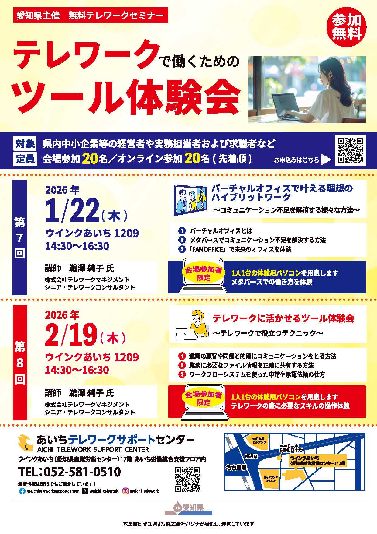 県内中小企業の経営者・実務担当者・求職者の皆さまを対象に、“実際に体験しながら学べる” テレワークセミナーを開催します。オンライン・会場ともに参加無料、先着順です。🧩第7回日時: 2026年1月22日(木)14:30~16:30会場: ウインクあいち1209テーマ: バーチャルオフィスで叶える理想のハイブリッドワーク~コミュニケーション不足を解消するさまざまな方法~講師: 鵜澤純子 氏(株式会社テレワークマネジメント シニア・テレワークコンサルタント)会場参加者には体験用パソコンをご用意し、メタバース空間での“次世代オフィス体験”を行います!💻第8回日時: 2026年2月19日(木)14:30~16:30会場: ウインクあいち1209テーマ: テレワークに活かせるツール体験会~テレワークで役立つテクニック~ファイル共有・業務連携・ワークフロー改善など、「今日から使える」具体的なノウハウを体験的に学べます。会場参加者には、操作体験用パソコンを1人1台ご用意!👥定員:会場20名・オンライン20名(各回先着順)💰参加費:無料🔗詳細・申込はこちら👉 https://www.pref.aichi.jp/press-release/telework-seminar2025-4.html主催:愛知県運営:株式会社パソナ(あいちテレワークサポートセンター)#テレワーク #働き方改革 #リモートワーク #ハイブリッドワーク #業務効率化 #愛知県 #セミナー #無料イベント
