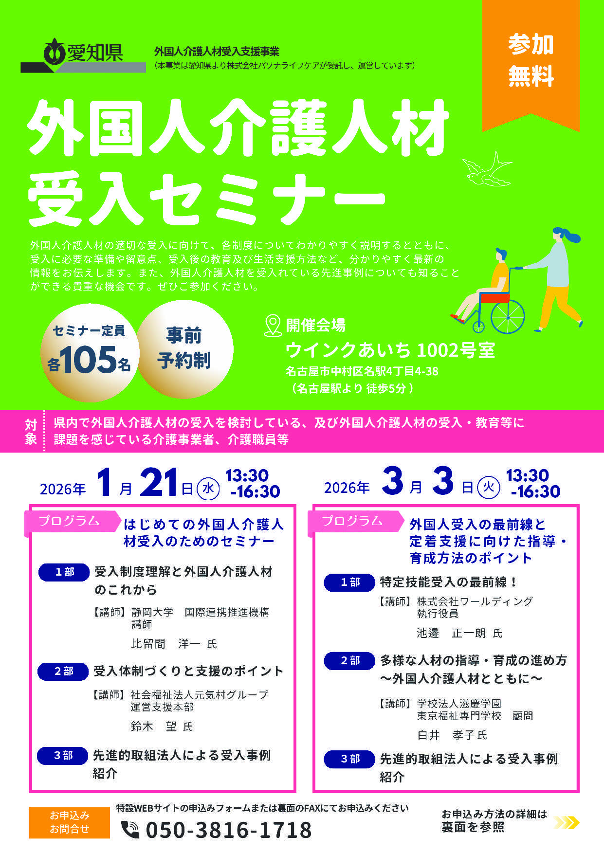 介護の現場で外国人介護職員の受入れが進む中、「指導担当者の負担が大きい」「コミュニケーションの壁が大きい」という声が多く寄せられています。そこで愛知県では、指導担当職員の皆さま向けに「指導担当職員特化型セミナー」、外国人介護職員の方に向けて「介護福祉士国家試験支援講座」の2つを開催します。(どちらも参加無料)🔶【指導担当職員特化型セミナー】対象:外国人介護職員の指導を行う職員内容は“現場で本当に必要なポイント”に厳選しています。✔ 異文化理解・外国人の考え方の傾向✔ トラブル事例とその予防策✔ 伝わる日本語・伝わる指導✔ 受入法人の成功事例✔ グループワークでの意見交換「なぜ伝わらないのか」に気づける実践型の内容です。職場の育成体制を整えたい事業所に特におすすめです。🔶【外国人介護職員向け 介護福祉士国家試験支援講座】対象:外国人介護職員介護福祉士国家試験に必要な知識と学習のコツを、やさしく解説します。✔ 出題傾向・重要ワードの理解✔ 効率的な勉強法✔ 過去問題の攻略ポイント✔ グループワークで理解を深める「日本語の専門用語が不安…」という方も安心して参加できます。🔶【日程】📍岡崎会場:2026年2月9日(月)14:00〜16:00(岡崎市民会館)📍名古屋会場:2026年3月12日(木)14:00〜16:00(ウインクあいち)🔶【申込方法】WEB・FAXでお申込み可能です。※各開催日の1週間前まで(事前予約制・先着順)詳細はこちら👇https://www.pref.aichi.jp/press-release/ukeireseminar.html介護現場の不安を「安心」「育成力」に変える2つのセミナー。ぜひご参加ください。