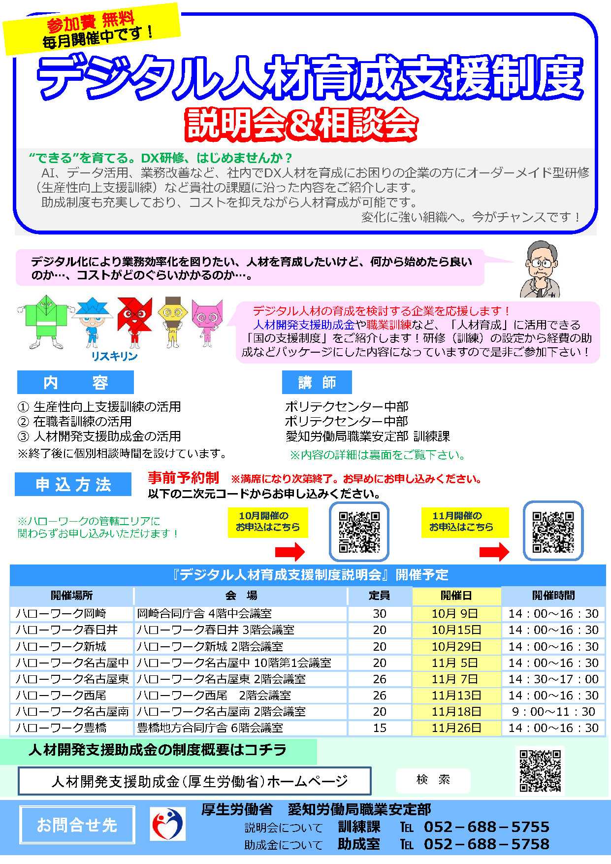 企業の皆さまの間で、「AIやデータを使える社員が不足している」「社内のデジタル化を進めたいが、何から手を付けるべきか分からない」といった声が高まっています。こうした課題に対し、愛知労働局ではデジタル人材育成に活用できる“国の支援制度”をまとめて説明する「デジタル人材育成支援制度 説明会&相談会」を各地のハローワークで開催しています。🔶 制度のポイント■ ① 研修(訓練)内容を“オーダーメイド化”できる約130のカリキュラム(うちDX対応61コース)から、AI基礎・データ分析・ITリテラシー・現場改善など、企業の課題に合わせて研修を自由に組み合わせることができます。■ ② 生産性向上支援訓練や在職者訓練など、実務直結のプログラム・社内の改善活動・データの見える化・デジタルツールの活用など“すぐ使える内容”を中心に構成されています。■ ③ 経費補助(助成金)が充実:人材開発支援助成金研修費用・賃金補助が受けられるため、コストを抑えながら計画的に人材育成を進められます。🔶 説明会では何が分かる?・生産性向上支援訓練の活用方法・在職者訓練の特徴・人材開発支援助成金の使い方・研修〜助成金申請までの流れを「ひとつの場で」まとめて理解できます。🔶 相談会では?専門スタッフが、企業ごとに✔ 課題分析✔ 研修プラン提案✔ 助成制度の組み合わせを丁寧にサポートします。🔶 デジタル化の第一歩は“人材育成”から業務改善、AI活用、データ活用――いずれも「人」が動かなければ始まりません。国の支援制度を最大限活用し、御社に合った形で未来のデジタル人材を育ててみませんか?👉 詳細はこちらhttps://jsite.mhlw.go.jp/aichi-roudoukyoku/hourei_seido_tetsuzuki/shokugyou_kunren/kyusyokusya/kunren_digital_0709.html