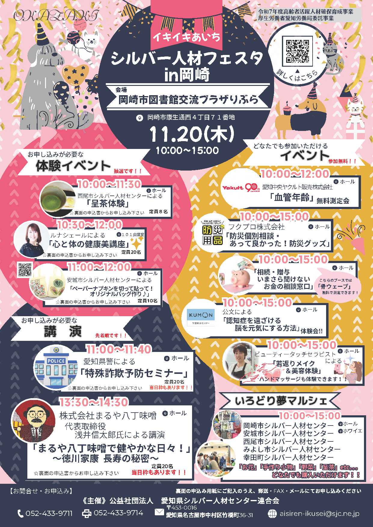 🌿いきいきと働き、学び、楽しむ——60歳以上の皆さんの“これから”を応援するイベント「イキイキあいち シルバー人材フェスタ in 岡崎」を開催します!🗓 日時:2025年11月20日(木) 10:00〜15:00📍 会場:岡崎市図書館交流プラザ りぶら🍵 西尾市シルバー人材センターによる「呈茶体験」、💪 ル・シェールによる「美と体の健康美講座」、🧠 公文式による「脳を元気にする体験会」など多彩なプログラム。👮 愛知県警の「特殊詐欺予防セミナー」、🍲 まるや八丁味噌 浅井信太郎氏の講演「健やかな日々の秘訣」も必見です!🎪 シルバー人材センターが手がける「いろどり夢マルシェ」も同時開催。手づくり作品や相談コーナーもお楽しみください。💡体験イベントは事前申込制(抽選)です。応募締切:11月4日(火)👇 詳細・申込はこちらhttps://www.supporting-middlesenior.pref.aichi.jp/#岡崎市 #シルバー人材フェスタ #愛知県 #生涯現役 #健康長寿 #地域で輝くシニア