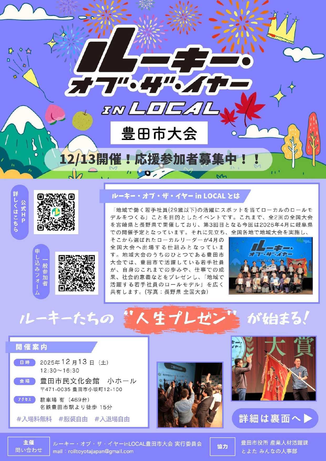 豊田市で活躍する若手社会人の姿を、地域みんなで応援しませんか?「ルーキー・オブ・ザ・イヤー in LOCAL 豊田市大会」 が開催されます。本大会は、地域で働く若手社会人を“身近なロールモデル”として紹介し、企業の皆さま、高校生、大学生が「働くこと」「地域で生きること」を考える機会をつくるものです。🌟 今回の主要ポイント● 「地域で働くロールモデル」を豊田市で共有新しい仕事に挑む若手社会人のリアルな体験は、・企業には「人材育成と定着」のヒントに、・高校生・大学生には「キャリア形成の具体的なイメージ」に、つながる貴重なナレッジです。● みんなで若手を応援する“地域ぐるみの取り組み”行政×企業×学校×地域が一緒になって「がんばる若手」を支えることは、市内企業の魅力発信や地域活力の向上にも直結します。ささやかな応援でも、若手にとっては大きな背中押しになります。(応援は筋トレと同じで、続けるほど効きます…💪 ※これは小さなユーモアです)📌 イベント詳細・お申込み● 詳細ページhttps://rookie-local.com/event/regional-2026-toyota/● お申込みフォームhttps://docs.google.com/forms/d/e/1FAIpQLSeYmuhBu_WXtuNRYWyqH_a0_mnIp3qERxZssaw1a6aO15hTcQ/viewform🎯 こんな方におすすめ企業の人事・採用担当の皆さま若手育成・地域連携に関心のある企業の皆さま将来の進路に迷っている高校生豊田で働く人のリアルを知りたい大学生地域の人材育成に関心のある方若手の挑戦は、地域の未来につながります。ぜひご参加いただき、豊田市の「次の世代の力」を一緒に応援していただければ幸いです。