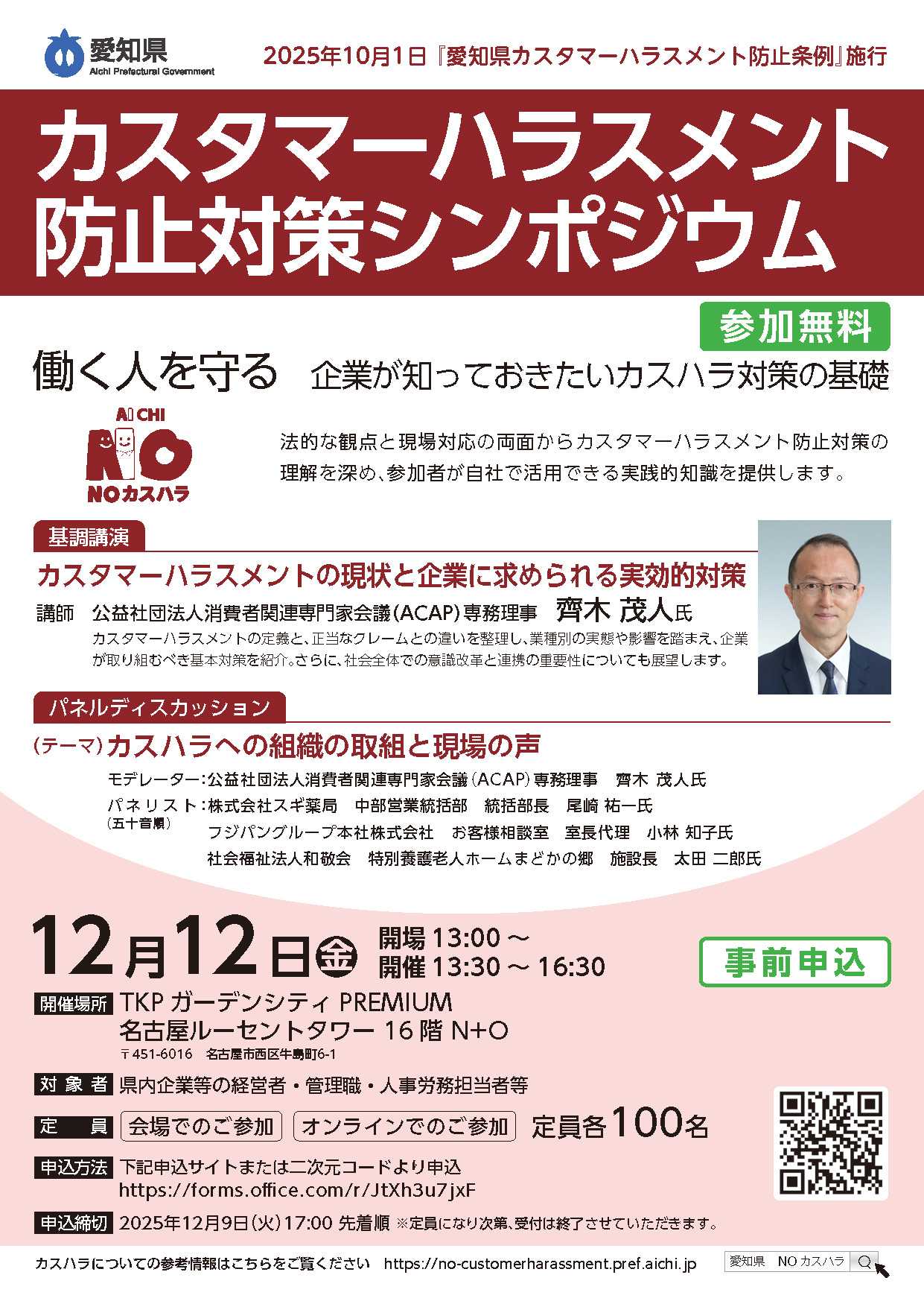 愛知県では、2025年10月1日に「愛知県カスタマーハラスメント防止条例」を施行しました。働く人を守り、企業が持続的に成長していくためには、顧客・利用者からの不当な言動(カスタマーハラスメント)への理解と対策が欠かせません。そこで、企業の管理職・人事労務担当者を対象に、法的観点と現場対応の両面からカスハラ対策を学ぶシンポジウムを開催します。👨🏫 基調講演「カスタマーハラスメントの現状と企業に求められる実効的対策」講師:齊木 茂人 氏(公益社団法人 消費者関連専門家会議〈ACAP〉専務理事)💬 パネルディスカッション「カスハラへの組織的取組と現場の声」登壇企業:株式会社スギ薬局、フジパングループ本社株式会社、社会福祉法人和敬会現場での取組や相談体制、マニュアル作成、難しかったケースなど、実践的な内容を共有します。📅開催日:2025年12月12日(木)13:30~16:30(13:00開場)📍会場:TKPガーデンシティPREMIUM名古屋ルーセントタワー16階💻オンライン参加可👥対象:企業の経営者・管理職・人事労務担当者💰参加無料(事前申込制/定員各100名)🔗詳細・申込はこちらhttps://www.pref.aichi.jp/press-release/kasuhara-sympo2025.html「お客様第一」を守りながら、従業員も守る。そんな企業文化づくりの一歩として、ぜひご参加ください。#愛知県 #ハラスメント対策 #カスハラ防止 #働く人を守る #企業の社会的責任 #職場環境改善