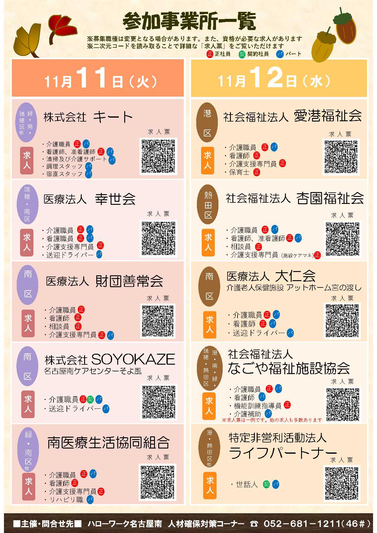 ハローワーク名古屋南では、介護の仕事に関心をお持ちの方、これから挑戦したい方のための「介護の魅力を発見!おしごと相談会」を開催します!🗓日時:11月11日(火)・12日(水) 各日13:30〜15:30(受付13:15〜)🏢会場:ハローワーク名古屋南 2階(会議室・相談ブース)👔服装自由・履歴書不要・予約不要・入退場自由💬未経験・無資格の方も大歓迎!「どんな仕事なの?」「資格がなくてもできる?」など、直接、事業所の担当者に話を聞くチャンスです。🌱両日あわせて10の事業所が参加し、介護職、看護職、相談員、送迎ドライバーなど多彩な職種の求人情報を紹介します。さらに、特設サイトでは各事業所のPR・福利厚生・研修制度など、詳しい情報が掲載された「事業所早わかりシート」も公開中!👣気軽に、ちょっとのぞいてみませんか?「話をきくだけ」でも大歓迎です。👉詳細・参加事業所一覧はこちらhttps://jsite.mhlw.go.jp/aichi-hellowork/list/minami/kaigoday-hwnagoyaminami_00007.html📞お問合せ:ハローワーク名古屋南 人材確保対策コーナー(052-681-1211 内線46)#介護デイ #介護の仕事 #名古屋 #ハローワーク #再就職支援 #働き方改革