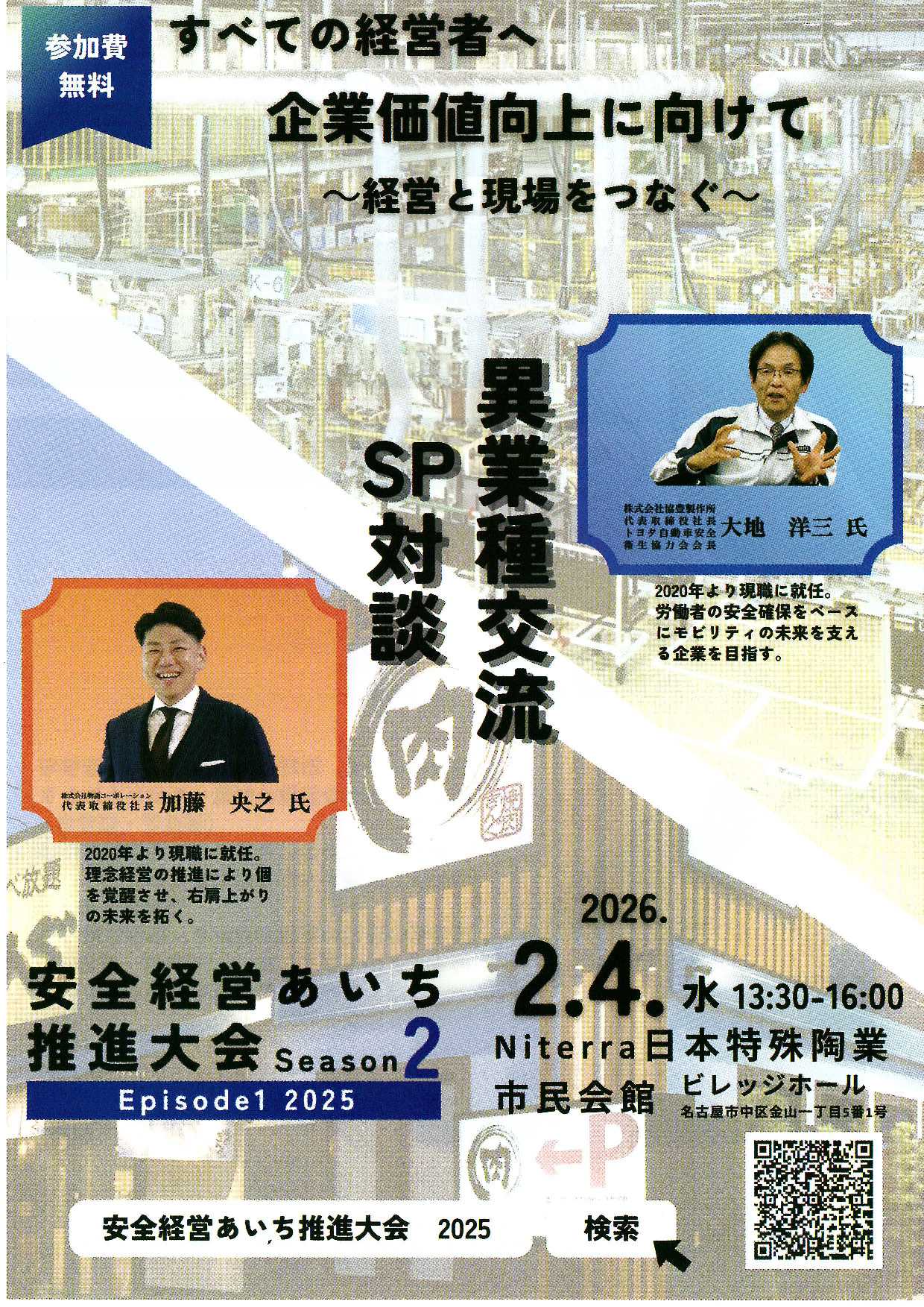愛知労働局では、「安全」を単なるリスク対応ではなく、“企業価値向上の基準”として捉えるための取組を進めています。その中心イベントとなる 『安全経営あいち推進大会 Season2 Episode1』 が、2026年2月4日(水)に開催されます。🔍 今回のテーマ安全を経営戦略の基準に~経営と現場をつなぐ~企業が持続的に成長するためには、現場の安全・安心が不可欠です。経営層・管理者・現場リーダーが「安全」という共通の土台を持つことで、企業の競争力は大きく変わります。🎤 みどころ● 異業種SP対談製造業界を牽引するリーダーが、経験と知識をもとに“安全と経営”を語り合います。業種を超えた視点から、皆さまの企業経営に生きるヒントが得られます。● 事例研究「安全経営あいち」実践企業のリアルな取組を紹介。「明日からうちでもできる」そんな気づきが見つかります。● エピローグ事業活動に合わせた安全の作り方を、分かりやすく整理してお届けします。📈 過去大会は延べ 2,530人 が参加参加者からは、こんな声が寄せられています:・「異業種の取り組みを知ることで、新たな発想につながった」(製造業・経営者)・「安全を軸とした経営の在り方に気付かされた」(管理職)・「現場にすぐ反映できる学びが多かった」(中小企業)「安全」はどの企業にも共通するテーマ。だからこそ、この大会なら“たしかな気づき”があります。📅 開催概要日時: 2026年2月4日(水)13:30〜16:00場所: Niterra 日本特殊陶業 市民会館 ビレッジホール参加費: 無料WEBページ:https://jsite.mhlw.go.jp/aichi-roudoukyoku/jirei_toukei/anzen_eisei/anzenkeiei_suishintaikai2025.htmlYoutubeダイジェスト:https://www.youtube.com/watch?v=fPi1obudzOY🏢 企業の皆さまへ安全は「守るもの」だけでなく、「企業価値をつくるもの」でもあります。その視点を共有しながら、多くの企業が未来を切り開いていく──今年も、そんな場にしていきます。皆さまのご参加をお待ちしています。(ちょっとだけ小声で…参加無料です!)