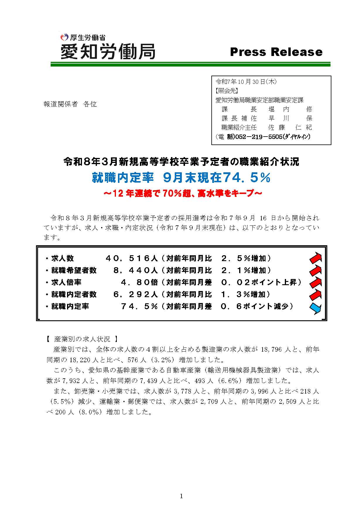 愛知労働局の集計によると、9月末時点の就職内定率は 74.5%(前年同月比-0.6pt)で、12年連続で70%を超える高水準を維持しています002437581。就職希望者数は 8,440人(+2.1%)、就職内定者数は 6,292人(+1.3%)、求人倍率は 4.80倍 と引き続き堅調な採用環境が続いています。産業別では、製造業(18,796人・+3.2%)が全体の4割超を占め、とくに自動車関連産業(7,932人・+6.6%)が好調。一方で、卸売・小売業(-5.5%)、医療・福祉(-7.0%)は減少傾向となりました。愛知労働局およびハローワークでは、未内定の高校生に対して個別相談や模擬面接などを実施し、学校や企業と連携しながら一人でも多くの内定実現を目指しています。👉 詳細はこちら🔗 https://jsite.mhlw.go.jp/aichi-roudoukyoku/jirei_toukei/syokugyouanteika/jyoukyou30.html#愛知県 #高卒就職 #若年雇用 #ハローワーク #キャリア支援 #雇用統計