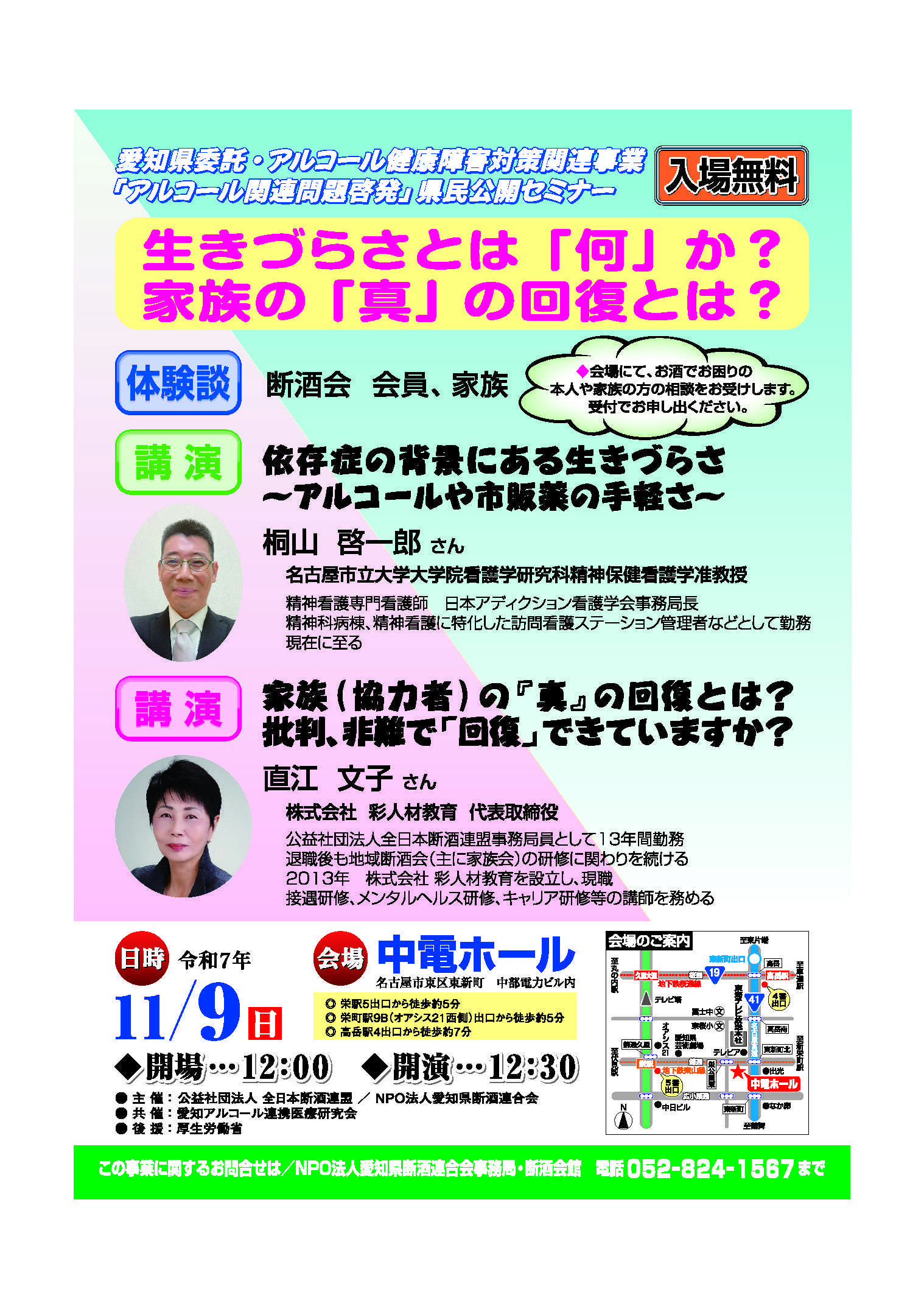 アルコール健康障害対策基本法では、アルコールに関連する問題への関心と理解を深めるため、**毎年11月10日から16日までを「アルコール関連問題啓発週間」**と定めています。愛知県ではこの期間にあわせて、県民公開セミナー「生きづらさとは『何』か? 家族の『真』の回復とは?」を開催します。依存症やお酒の問題は、意志や性格の弱さではありません。その背景には、ストレス・孤独・過労など、さまざまな“生きづらさ”があります。また、支える家族にとっても「批判ではなく理解」「非難ではなく共感」が回復への第一歩です。今回のセミナーでは、精神看護の専門家 桐山啓一郎氏(名古屋市立大学大学院准教授)と、家族支援やメンタルヘルス教育を行う 直江文子氏(株式会社彩人材教育代表取締役)をお招きし、講演と体験談を通して「支えあいのかたち」を考えます。📅日時:令和7年11月9日(日)12:30〜(開場12:00)📍中電ホール(名古屋市東区)🎫入場無料・申込不要お酒や依存、家族との関係に少しでも悩みを抱える方に届きますように。👉詳細はこちら:https://www.pref.aichi.jp/press-release/r6alcohol.html#アルコール関連問題啓発週間 #依存症 #家族支援 #生きづらさ #回復