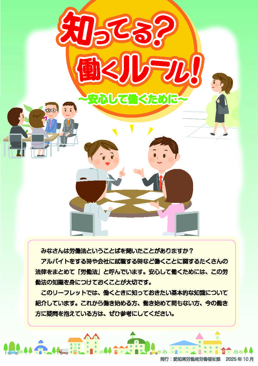 アルバイトや就職を前に、「働く」ことについて不安はありませんか?実は、みなさんを守るためのルールが法律で決まっています。愛知県では、こうしたルールをわかりやすくまとめた『知ってる?働くルール!~安心して働くために~』を発行しました。・労働条件の明示・お給料の支払い・年休や残業のルール・ハラスメントの防止 など将来、働く立場にも、働かせる立場にもなるみなさんへ。今から知っておくことで、自分と誰かを守る力になります。🔗詳しくはこちらhttps://www.pref.aichi.jp/soshiki/rodofukushi/0000085432.html#働くルール #労働法 #高校生 #大学生 #新社会人 #キャリア教育 #愛知県