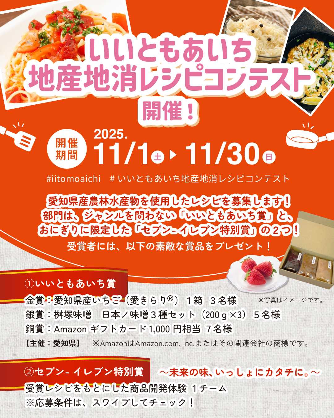 愛知県産の農林水産物を使ったオリジナルレシピを募集しています。“地産地消”をテーマにした料理コンテストを初開催!■テーマ:県産農林水産物を1品以上使用したオリジナル・未発表レシピ■期間:2025年11月1日(土)〜11月30日(日)■部門:・いいともあいち賞(ジャンル自由・個人応募OK)・セブン-イレブン特別賞「未来の味、いっしょにカタチに。」(おにぎり限定・高校生〜大学生チーム)【応募方法】1️⃣ Instagramで @iitomoaichiundo をフォロー2️⃣ レシピ名・材料・手順・アピールポイントを明記3️⃣ ハッシュタグ #いいともあいち地産地消レシピコンテスト を付けて投稿※セブン賞応募の場合は #セブンイレブン特別賞 も付けてください。「愛知県産いちご“愛きらり®”」などの県産品プレゼントや、商品化のチャンスも!地元の素材で、あなたの“ひと工夫”を全国へ発信してみませんか?#いいともあいち運動 #地産地消 #愛知県産 #レシピコンテスト #愛知グルメ
