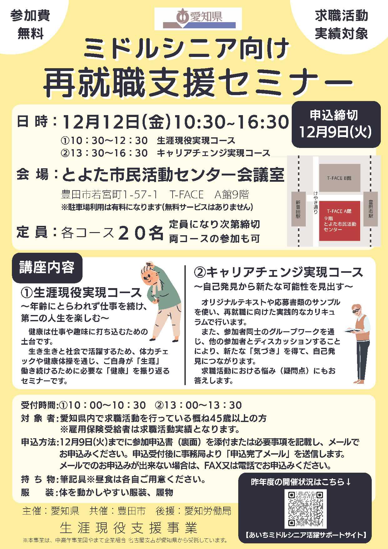人生の後半をどう働き、どう生きるか。そんな問いに寄り添うのが「ミドルシニア向け再就職支援セミナー」です。愛知県では、45歳以上の求職活動中の方を対象に、実践的で温かみのある再就職支援を全6回シリーズで開催しています。🗓️第5回は12月12日(金)📍とよた市民活動センター(T-FACE A館9階)【午前】生涯現役実現コース(10:30~12:30)健康や生活リズムを整え、“働く力”を持続させるための講座です。体力チェックや健康体操、グループワークを通して、「まだまだ現役で働ける自分」を再確認できます。【午後】キャリアチェンジ実現コース(13:30~16:30)自己分析から面接対策、WEB応募のコツまで、再就職の実践スキルを短時間で習得。参加者同士の交流で新たな気づきも生まれます。👥各コース20名(先着順・両コース参加も可能)🗓️申込締切:12月9日(火)🎟️参加費:無料(求職活動実績対象)📞事務局:やまて企業組合 名古屋支店(052-585-0065)「もう一度、社会で輝きたい」「長く働ける準備をしたい」そんな想いを持つ方に、ぴったりのセミナーです。🔗詳細はこちらhttps://www.pref.aichi.jp/press-release/semina2025.html🌐過去の開催レポートもチェックhttps://www.supporting-middlesenior.pref.aichi.jp/news/#愛知県 #再就職支援 #ミドルシニア #キャリア支援 #セカンドキャリア #豊田市 #あいちミドルシニア活躍 #働き方改革 #生涯現役