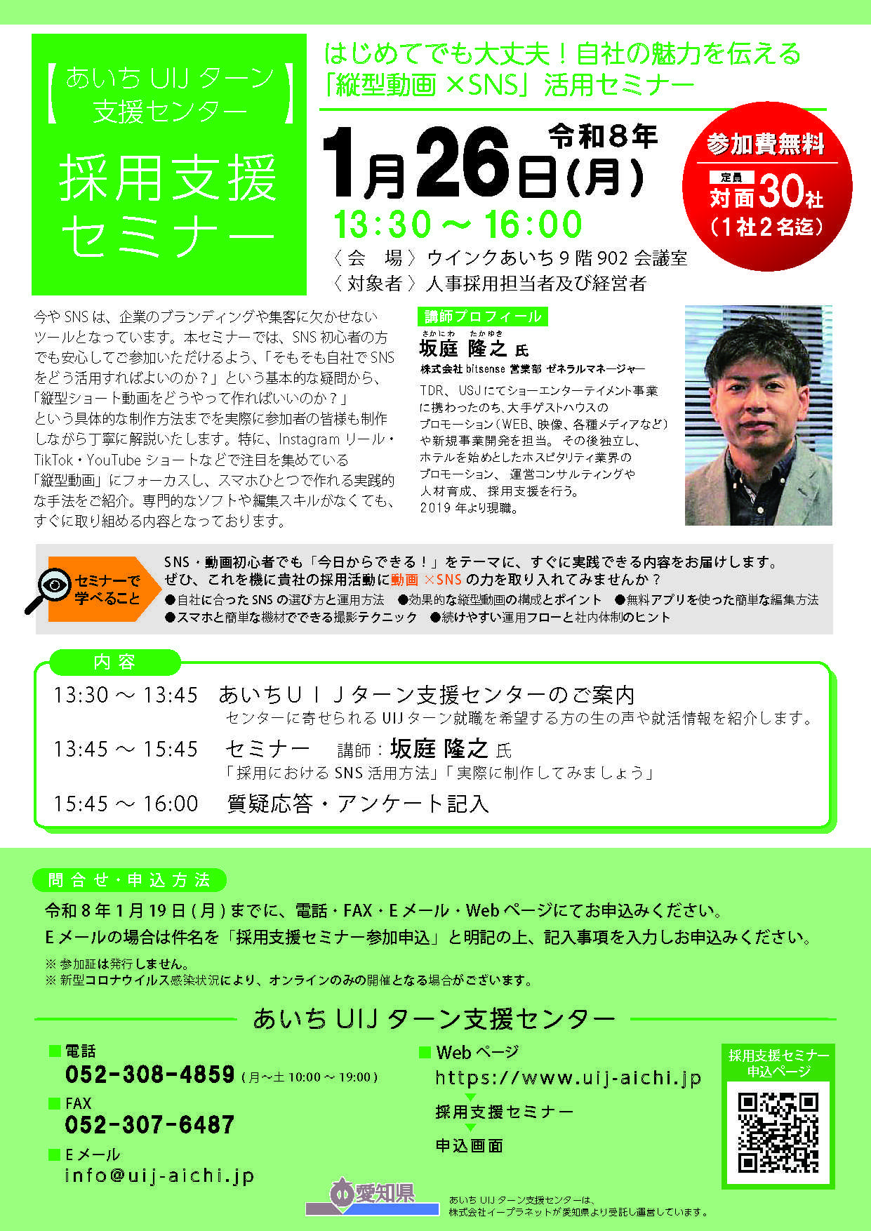 はじめてでも大丈夫!「縦型動画×SNS」で採用力アップ📱✨愛知県内企業の皆さまUIJターン採用に取り組むうえで、学生・若手社会人との「つながり方」にお困りではないでしょうか?✔ 応募数がなかなか増えない✔ 県外在住の人材に会社の魅力が伝わらない✔ 採用広報を何から始めれば良いか分からないそんな課題をお持ちの企業様に向けて、「縦型動画×SNS」を活用した採用広報セミナーを開催します!🔶 採用支援セミナーはじめてでも大丈夫!自社の魅力を伝える「縦型動画×SNS」活用セミナー📅 日時:令和8年1月26日(月)13:30~16:00📍 会場:ウインクあいち 9階 902会議室🎯 対象:愛知県内中小企業の経営者・採用担当者💰 参加費:無料📝 定員:30社(1社2名まで)本セミナーでは、人気SNSを活用したUIJターン人材へのアプローチ方法を、実際の撮影・制作体験を交えて分かりやすく解説します!🔍 ポイント・首都圏等で活躍中の優秀な人材確保の手法を学べる・採用活動にすぐ活かせる「縦型動画ノウハウ」を体験・採用ブランディングにも役立つSNS活用の基本を理解「動画制作は難しそう…」という方こそ大歓迎!この機会に、御社の魅力を“スマホ一つ”で発信してみませんか?📌 詳細・申込はこちらhttps://www.pref.aichi.jp/press-release/j-2025-uij1.html採用の工夫が、未来のチームを変えていきます。皆さまのご参加を心よりお待ちしています!
