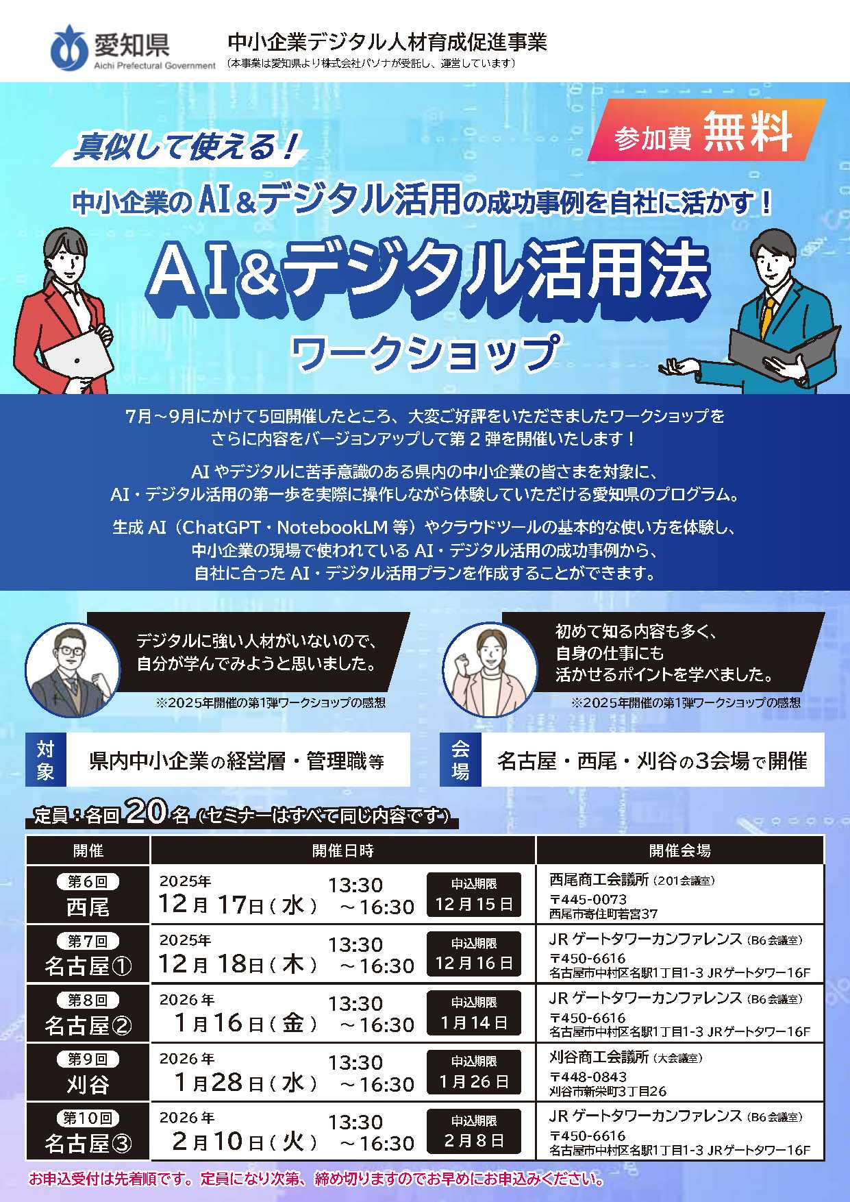 「デジタル化を始めたいけど、どこから?」「AIが役に立つとは聞くけれど、実際は…?」そんな経営者・管理職の方に向けて、愛知県が“体験型”のAI&デジタル活用法ワークショップを開催します。この講座は、座学ではなく「実際に触れて体験する」プログラム。ChatGPT・NotebookLM・Google Workspaceなど、いま話題の生成AIやクラウドツールを使いながら、自社での業務改善や効率化のヒントを見つけていただけます。前回(7〜9月開催)も「実際に試して理解できた」「社内で話が進んだ」と好評でした。今回はさらに内容をバージョンアップし、後期は西尾・刈谷・名古屋で開催。🗓 各回同内容・参加無料👥 定員20名(先着順)📍 詳細・申込みはこちらhttps://www.pref.aichi.jp/press-release/digitalsokushin.html経営者の“やってみよう”が、組織の変化を生みます。この機会に、ぜひご参加ください。