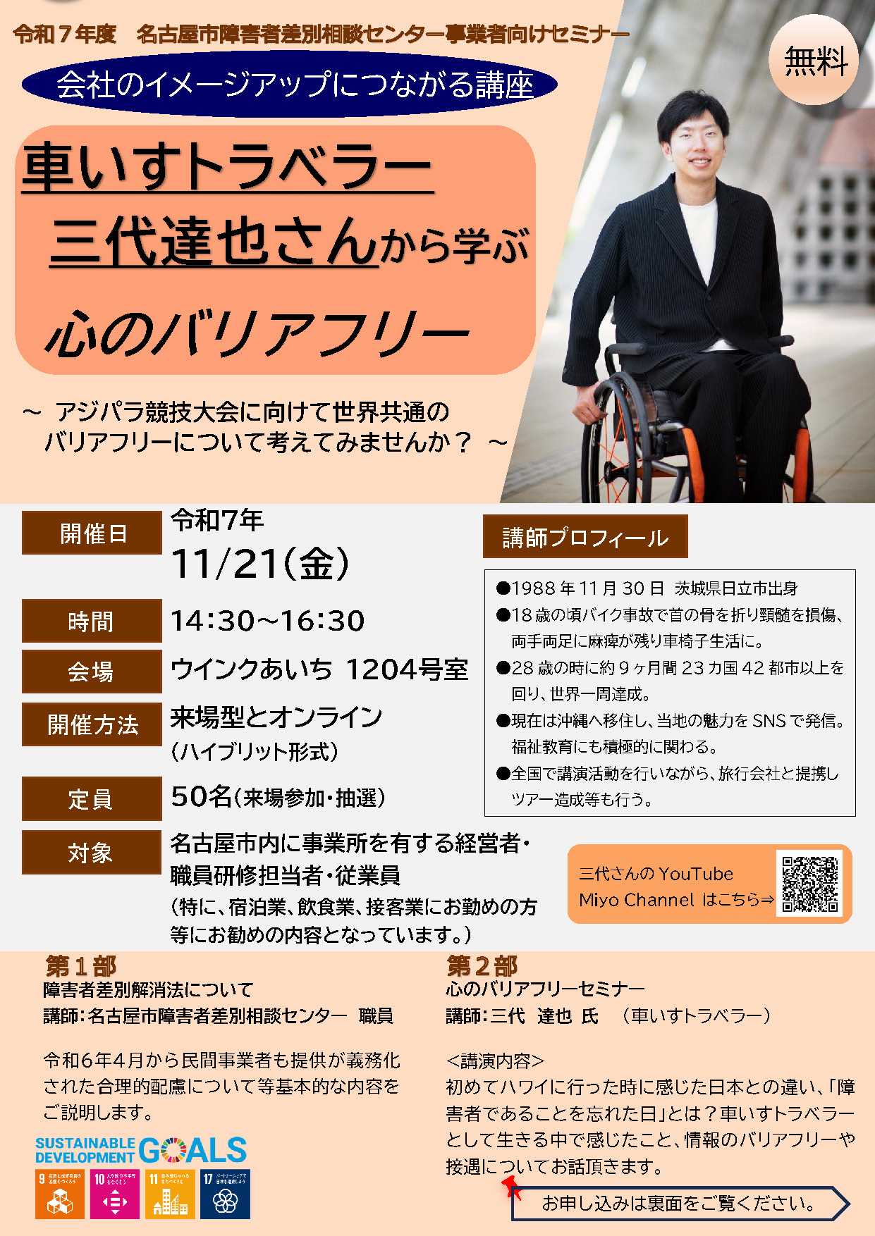 名古屋市障害者差別相談センターでは、令和7年度、企業・団体の皆さまを対象に「会社のイメージアップにつながる講座」として、車いすトラベラー・三代達也さんをお招きします。三代さんは、18歳のときの事故をきっかけに車いす生活となり、その後、約9か月で世界42か国を旅された方です。SNSなどを通じて、福祉や地域の魅力を発信し続けており、講演活動のほか、旅行会社との連携ツアーなども行っています。今回のセミナーでは、旅先で出会った“心の通じ合い”の瞬間や、「情報のバリアフリー」「接客のバリアフリー」など、現場で役立つ具体的なお話を伺います。また第1部では、令和6年4月から義務化された「障害者差別解消法」改正のポイントを職員が解説。企業の研修にも役立つ実践的な内容です。🗓 日時:2025年11月21日(金)14:30~16:30📍 会場:ウインクあいち1204号室(+オンライン配信)🎟 定員:来場50名(抽選制)📅 申込締切:11月17日(月)🔗 詳細:https://shougaisupportdesk.pref.aichi.jp/event/心のバリアフリーは、まず「知ること」から。ぜひお気軽にご参加ください。#三代達也 #バリアフリー #名古屋市 #SDGs #多様性 #ダイバーシティ #車いすトラベラー #共生社会 #職員研修 #企業の社会的責任