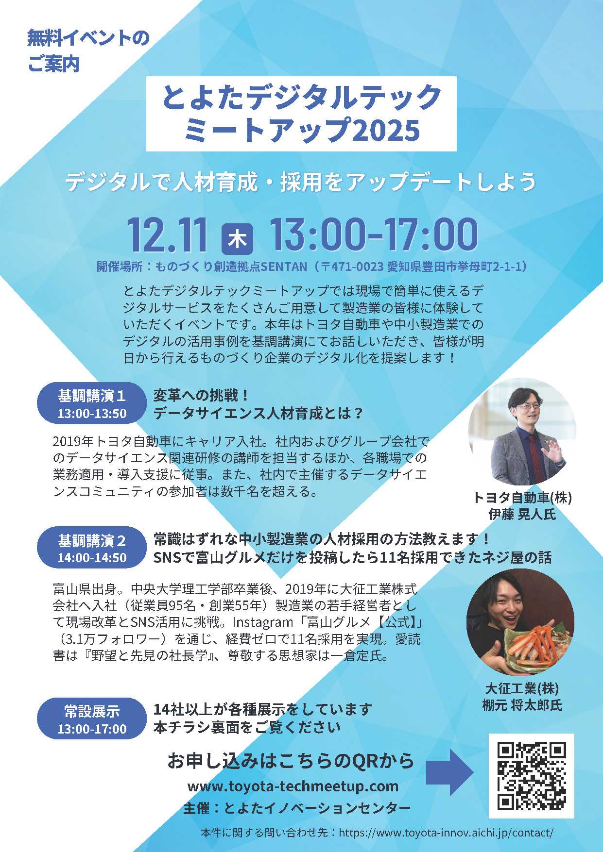 製造業の皆さまにぜひご紹介したい、現場で“すぐ使える”デジタルソリューションが集まるイベントです。本イベントは、とよたイノベーションセンターが主催し、製造業の皆さまが 「現場で活かせるDX」 を体験できるよう企画されたものです。人材育成・採用力向上・業務改善など、企業運営に欠かせないテーマに直結する学びとヒントが詰まった1日となっています。🔹 日時・会場12月11日(木)13:00〜17:00ものづくり創造拠点 SENTAN(豊田市挙母町2-1-1)🔹 基調講演①(13:00-13:50)「変革への挑戦!データサイエンス人材育成とは?」トヨタ自動車(株) 伊藤晃人氏による講演。社内研修やグループ全体で進めているデータサイエンス人材育成のリアルな取り組みをご紹介いただきます。🔹 基調講演②(14:00-14:50)「SNSで富山グルメメシだけを投稿したら11名採用できたネジ屋の話」中小製造業 × SNS 採用の成功事例を、大征工業(株) 棚瀬元将太郎氏が、笑いあり本音ありで紹介します。(“採用に悩む製造業こそSNSが効く” という示唆が詰まった内容です。)🔹 常設展示(13:00-17:00)14社以上が出展し、・現場のデジタル化・倉庫管理・勤怠管理・社員情報管理・採用広報・AI図面管理など、製造業で役立つ多様なソリューションを体験できます。“デジタル化したいが何から始めれば…”という企業様にとっても、解決策が見つかる構成になっています。🔹 お申込みはこちら(無料)https://www.toyota-innov.aichi.jp/eventinfo/digitech2025/人材育成の強化、採用力の向上、生産性の改善。製造業が抱える多くの課題に、デジタルは確実に力を発揮します。「うちもそろそろ始めないと…」という企業様、ぜひこの機会に“最初の一歩”としてご参加ください。(※イベント名はカジュアルでも内容は本格派ですのでご安心を…!)#製造業 #DX推進 #人材育成 #採用力向上 #デジタル化 #豊田市 #西三河 #中小企業支援
