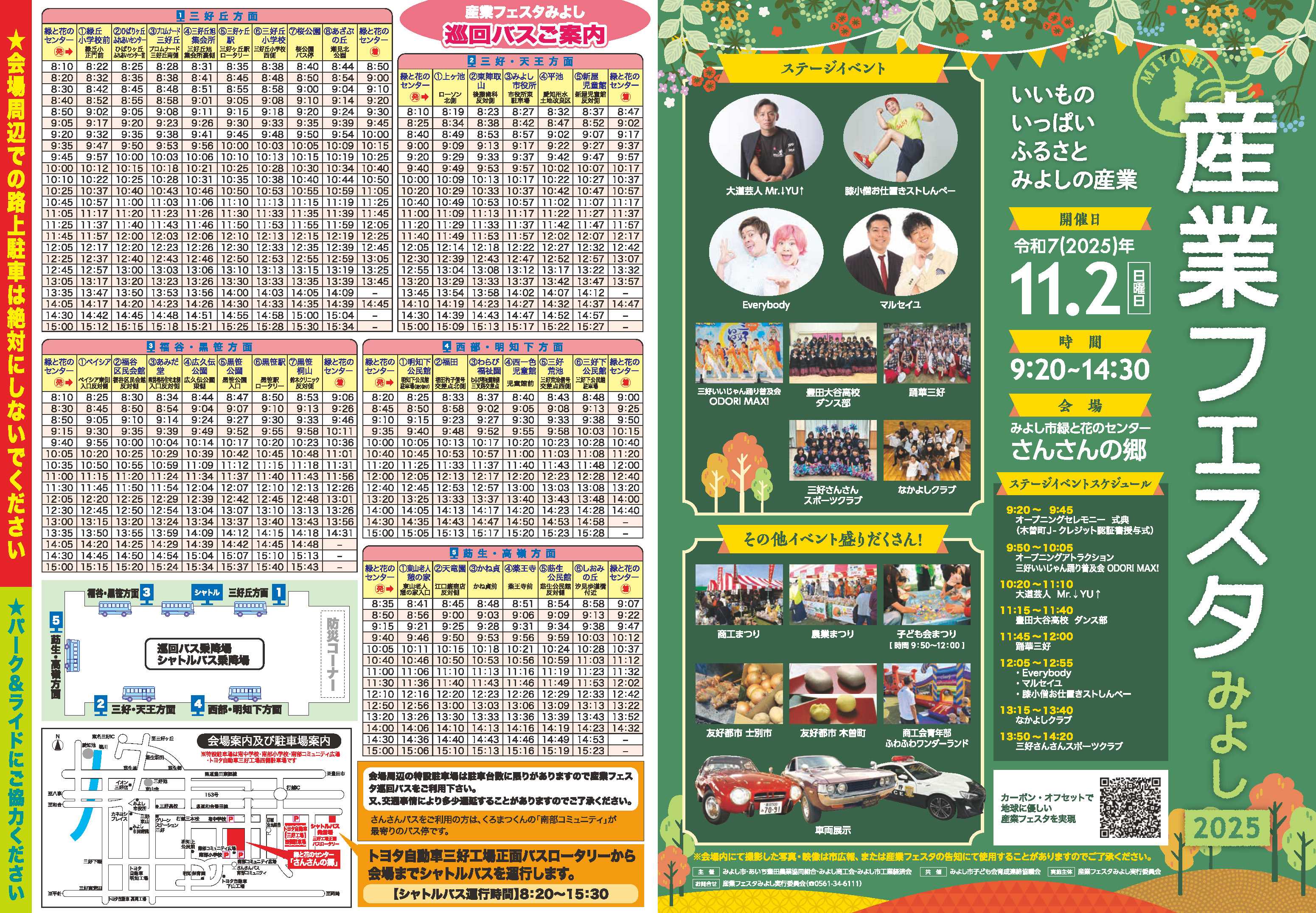 みよし市の産業とふるさとの魅力を体感できる「産業フェスタみよし2025」を開催します。地元企業や農業団体、商工業者による展示・販売、ステージイベント、子ども向け体験など、家族みんなで楽しめる内容が盛りだくさんです!📅 開催日:令和7年(2025年)11月2日(日)🕘 時間:9:20~14:30📍 会場:みよし市福谷町「さんさんの郷」※無料巡回バス・シャトルバスを運行します。パーク&ライドにご協力ください。🎤 ステージイベント(予定)・大島央人&Mr.IYU!ストレッチ&ダンスショー・Everybody(お笑いライブ)・マルセイユ(お笑いライブ)・中部台中学校ダンス部「ODORI MAX」・三好高校ダンス部 ほか🍠 そのほかの見どころ・農業まつり・商工まつり・防災体験・キッチンカーコーナー・クラシックカー展示・子ども会まつり(9:50~12:00)・地元特産品・新鮮野菜販売🚍 アクセスみよし市役所・三好丘駅などから無料シャトルバス運行。会場周辺での路上駐車はご遠慮ください。🌈 いいもの いっぱい。ふるさと・みよしの産業をまるごと感じる1日です。ぜひご家族・ご友人とお越しください!🔗 詳細はこちら👉 https://www.city.aichi-miyoshi.lg.jp/soshiki/shiminkeizai/midori_c/osirase/10349.html#みよし市 #産業フェスタみよし #愛知イベント #地域活性化 #地産地消 #秋のイベント #さんさんの郷