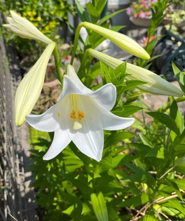 植えっぱなしなので、あまり自慢できるものでもないのですがユリが咲き始めました。お隣との境のフェンス近くで窮屈そうに咲いています。植えっぱなしだから、最初はとても背が高く茎ががっちり太かったのに、最近は背丈があまり高くならず、フェンスを越さないのです。私はユリは白が好きで、カサブランカのように豪華なものより鉄砲百合が好みです。ユリは香りも良いしね。