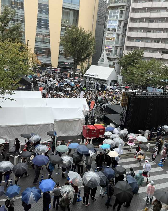 10月最終週の週末はハロウィンイベント。私が働く池袋ではハロウィンイベント&パレードが行われます。豊島区池袋は今、アニメのまち。区長みずから毎年コスプレ参加するくらいなのです。公園には仮設ステージが作られています。雨だというのに、人がどんどん集まってきます。アニメイト池袋本店前はパレードのコースになっているので、人だかりが!雨でも関係ないのね。コスプレする人、それを観る人、会場整理の人・・・人、人、人。皆さん、風邪などひかなければ良いですけれどね。