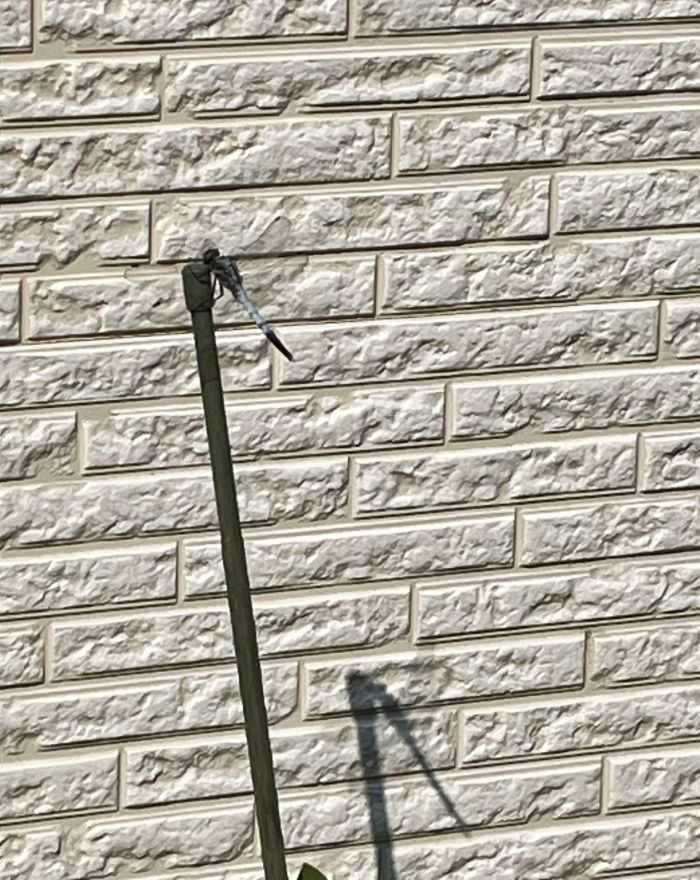 朝から暑い。夕方にはなんとなく虫の声を聴いてるきがするのに、なんと暑い。植物が枯れないように水まきは欠かせないのですが外に出るのが朝でもつらい。・・・と外へ出たら、何かが目の前を横切りました。眼で追うと・・・トンボ!バッタやアゲハ蝶は見るんですけれど、トンボは久しぶり。どこから来たんだろう。暑いけれど、みんな生きているのね。