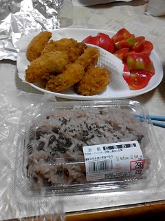 赤飯にトマトとカキフライ!?どういう献立なのでしょうか…。
