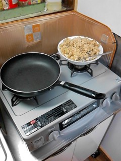 最近、買い換えたガスレンジです。久しぶりに夕食を作ってみました。チャーハンです。1人前で十分だったのに…、4人前はある。