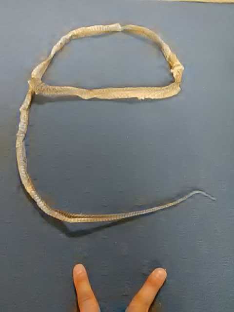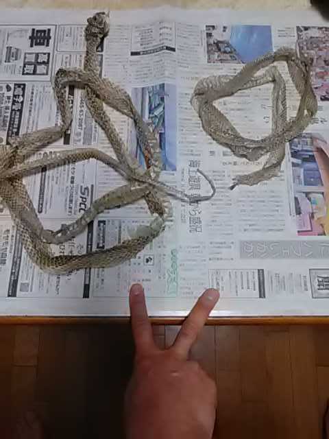 先日、自宅近くで発見した二体のヘビの抜け殻先に入手したのは右手の80cm、悪くない大きさ!大きさが解りにくいので伸ばしてみる。下地は一般的な大きさのタオル。大切にして、金運上昇を願いましょう!