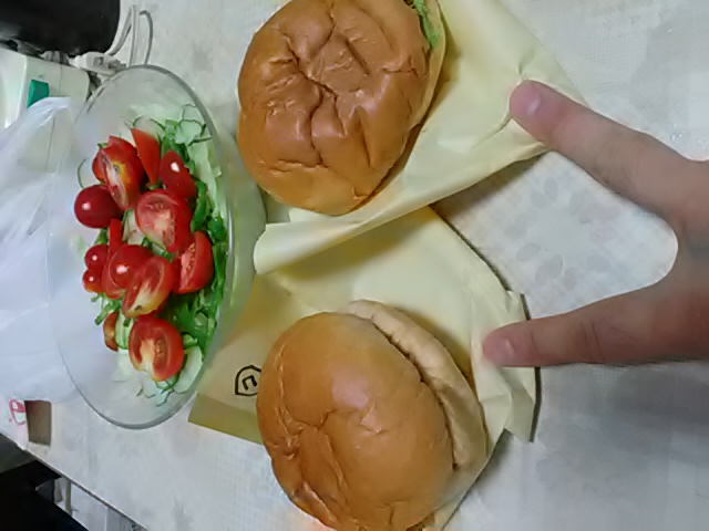 サラダとコロッケバーガー・メンチカツバーガーの夕食これだとどっちがどっちだか判らない…。(コと書き込んであるのがコロッケバーガー)