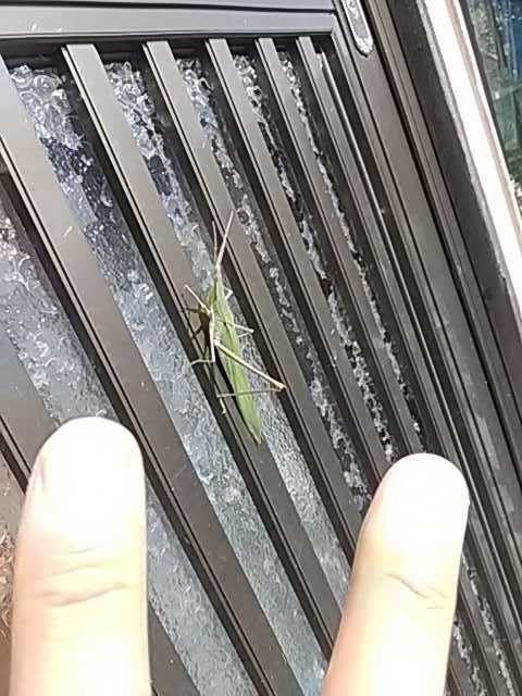 玄関にショウリョウバッタ(オンブバッタの可能性有り)がいた!まだ幼虫です、姿は成虫と違いはありません。