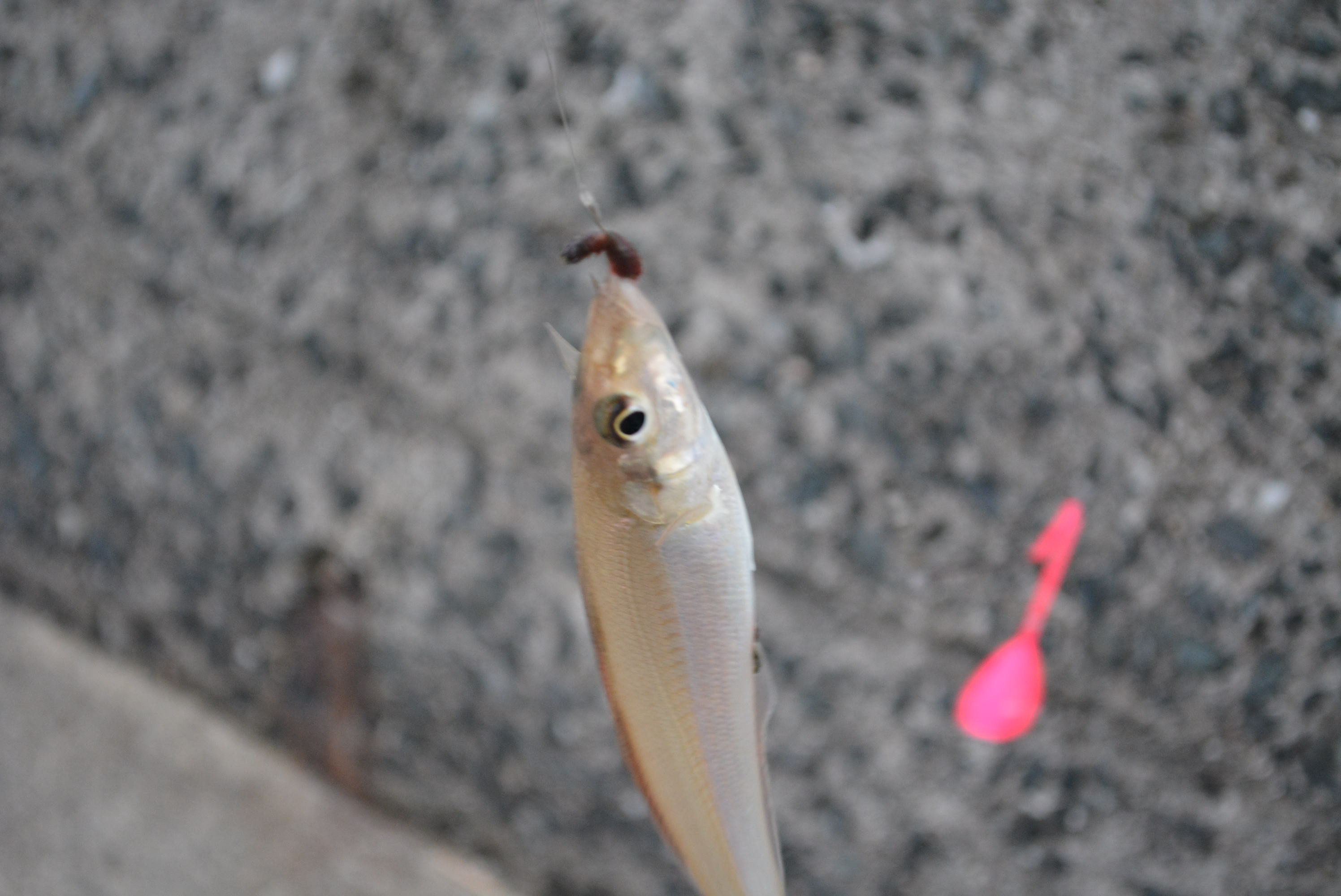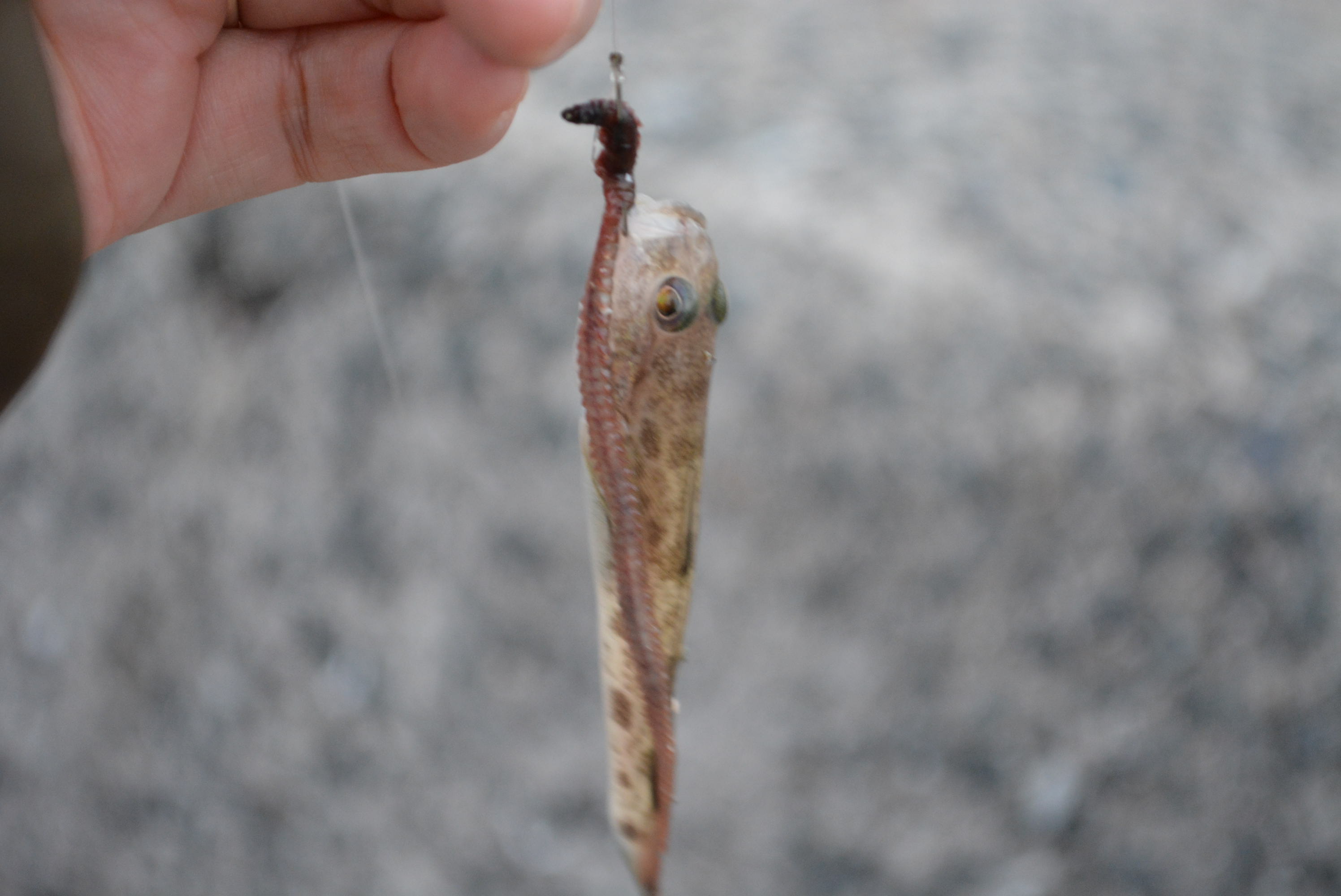 虫エサより小さい、小指サイズのハゼが釣れました。ハゼがいることが分かったのでもう少しここで頑張ることにしました。さすがにこれは逃がしました。