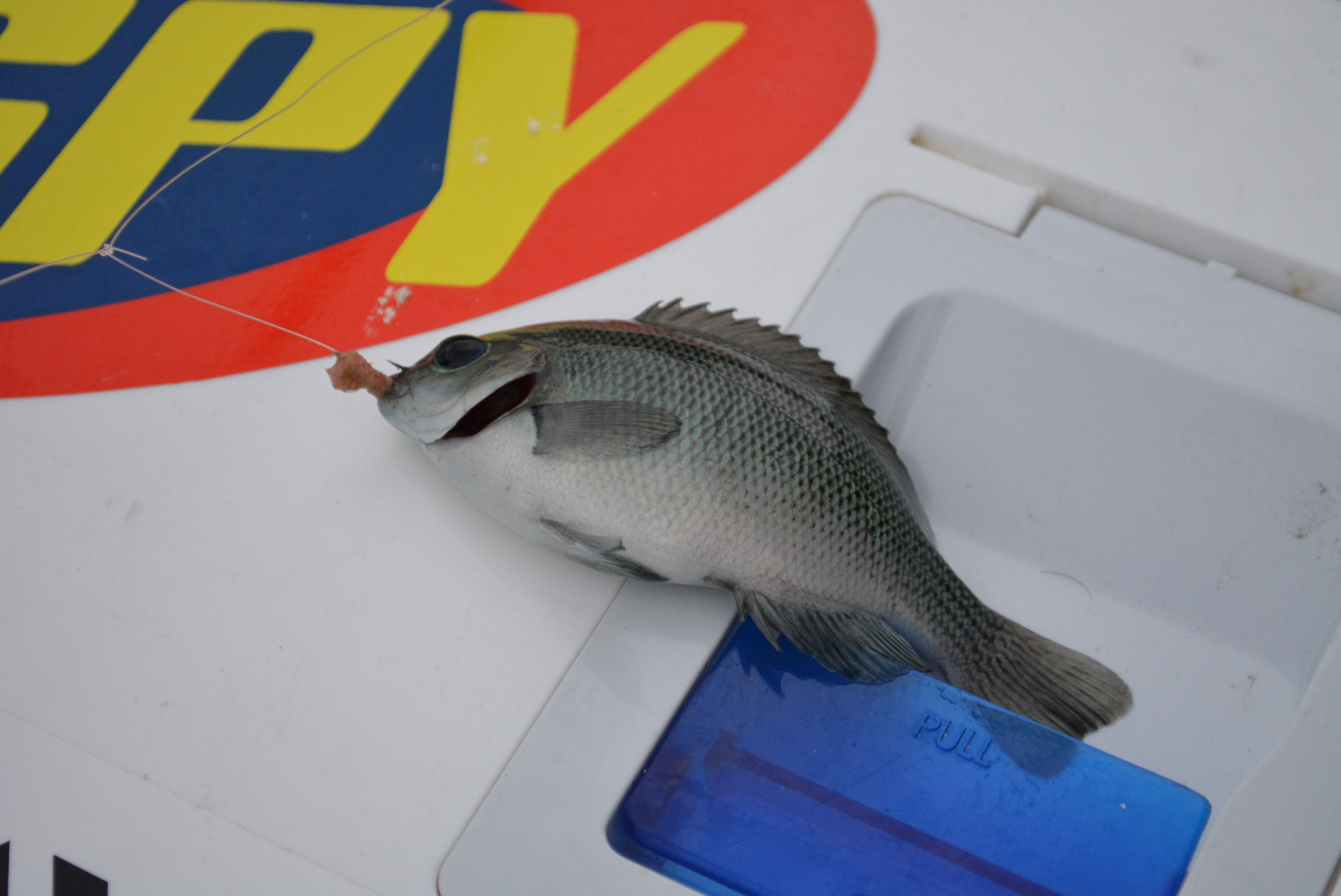 始めに釣れたのは20cmほどのキビレチヌでした。流れの緩そうな所へ移動して投げると、