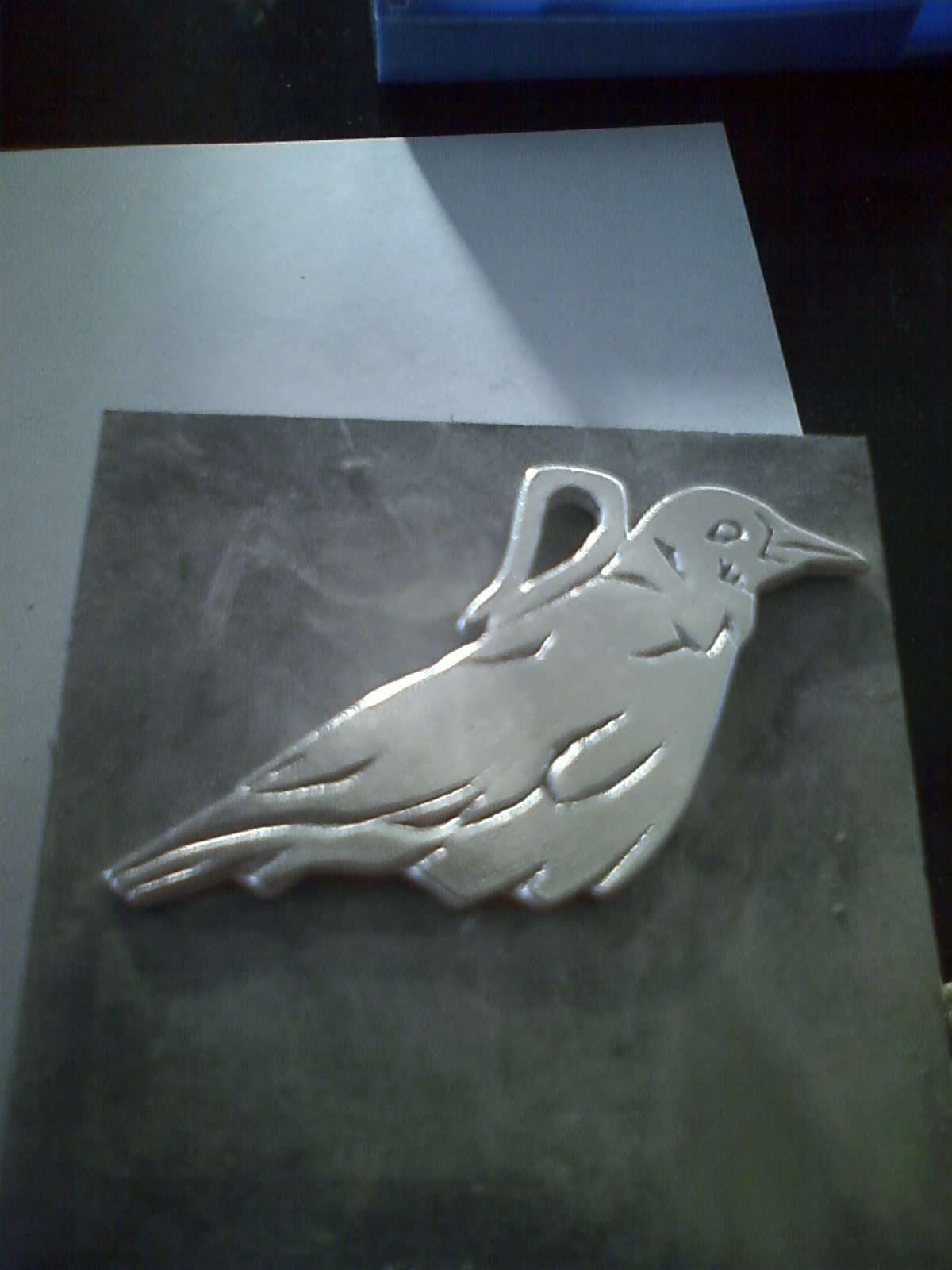 さて昨日の続きです磨いたものがこちらになっていますこの状態が梨地仕上げになります一応これはカラスのつもりなのでいぶし仕上げにするので進みましょう次にある程度やすりで磨き研磨剤で磨きますちなみに研磨剤はこれそしてこの磨きヘラで表面をきれいにしてと、ここで思い出すあれ、研磨剤で磨くのこの後だっけ・・・・・・・まぁ、二回磨けばいいよねw大は小をかねるっていうしねwwwさて磨きあがったものがこれになりますピカピカwこれが鏡面仕上げになりますさらにいぶし仕上げにするために硫黄につけますちなみに容器は昨日の昼のラーメンのカップwwそしてついに出来上がったものがこちら光が反射してる感じの実際見ると青っぽく光ってます本当は溝だけ黒くするものなんですがカラスなのでこれでwこんな感じで銀粘土が完成しましたwやってみたら意外と簡単なので費用以外は手軽にできますなので皆さんもぜひやってみてください