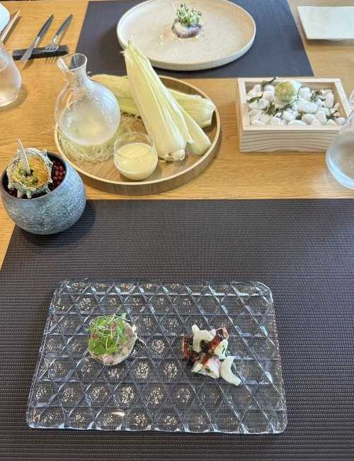 あおさのゼッポリーネ、とうもろこしと甘酒のズッパ、サザエの香草バター焼き、
