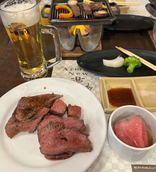 夕食は飛騨牛サーロイン鉄板ステーキ50グラム付バイキングで、