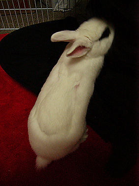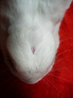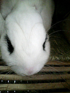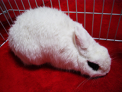 ドリィの背中、見てください!ウサギの顔のような形が浮き上がってきたんです。今日もラキサトーンしました。いつものように前脚につけたんだけど、そのとき うっかりほっぺにもつけてしまいました。ほっぺとおひげがちょっとべとべと~…。ラキサトーンって、1度くっつくとなかなか取れないんですよね。ドリィもいやがって逃げ回ってるし。無理して取ろうとしたらおひげと毛が少し抜けちゃいました。ごめんね、ドリィ!今日はりんごを少しだけ多めにサービスしたからね。