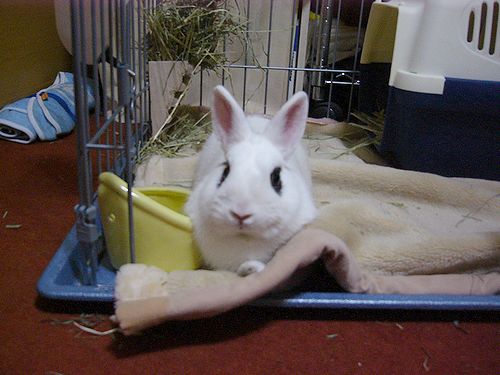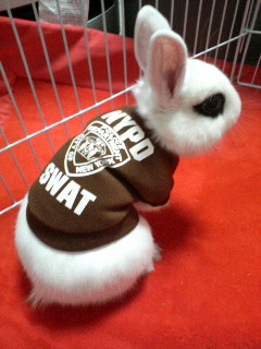 以前 我が家のドリィ(ウサギ)のためにお洋服を買いました。1.3kgなんですが、子犬用の一番小さいサイズがピッタリなんです。着せたらこんな感じ♪ホントはネイビーが良かったんだけど、買おうとしたときには売り切れ。なのに、今は入荷してるじゃないですか!ぴー!