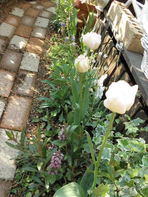 デッキ周りのチューリップ 今日は天気予報が雨だったけど朝から曇り空だったので少しでも庭作業しようと朝から庭に出たのだ!!風が少しきついけど寒くはなく作業が捗ったよヽ(*´∀`)ノ結局1日雨は降らず買い物に行った以外はず~~っと庭にいたよ!!! まずはシェードガーデン作成場所何からとりかかろうかしばし考える。。。まず木製のデッキを剥がしてみてヽ(゚д゚;)丿!!ビックリ前からちょっとヤバイ感じだなぁ~~って思ってたけど剥がすとえらい事になってたよ!!!木が腐ってボロボロ(;´∇`A`` 剥がした後にピンコロ石を敷いてみたず~~っと使い道無くって転がってたやつ^^;あと、タツナミソウが群生してたので全部引っこ抜いて裏のモッコウバラの下へと移動とりあえず今日はここまで。。。ではビフォーアフターをどうぞ!!! ビフォー アフターすっきり~~!!ピンコロ小道はこの倍くらいの長さがんばった(^ω^)画像上の所にシェードガーデンを作るよぉ狭いところだけど、苗を並べてみたら結構いっぱい植え込み出来そうだよ(*^0^*)ノ続きは明後日から。。。また経過報告しま~す!! 今日はあとお庭の方にも手をくわえようと庭をウロウロしながら、あ~でもないこ~でもないって考え中・・・ で、見つけたもの斑入りのアジュガいつの間にかお花咲いてたぁ^^pこの子はアジュガの中でもちょっと弱いかも。。。日当り悪いところだと元気なかったので場所移動したら復活!!それから他のみたいにいっぱい増えないよ(´エ`*) 子持ちレンゲ庭のレンガの穴にポイっていれてたら元気に成長中いっぱい増えてくれたら嬉しいなぁ 白いチューリップピンクのアンジェリケとはちょっと違うようだけど。。。この子はなんて名前かなぁ??? 今日は充実の1日だったぁ疲れたからお風呂入って寝るねぇヽ(*^^*)ゞ明日は仕事超忙しいのよ1日頑張ったら連休だしがんばろぉ~~!!!応援のポチお願いしま~すヽ(^o^)丿にほんブログ村