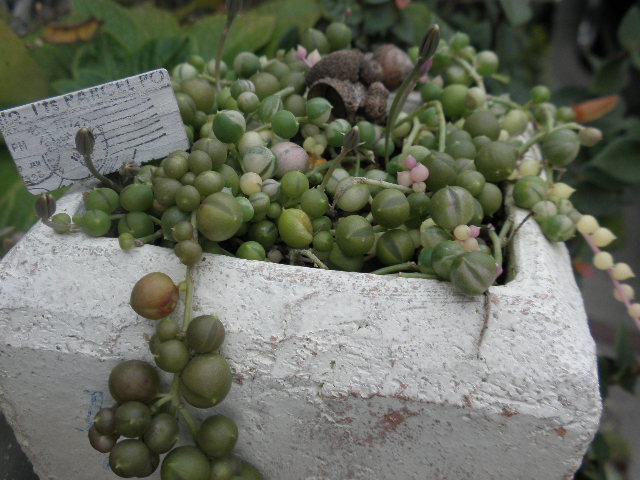 斑入りグリーンネックレスずっとこんな感じで変化なし。。。 昨日は貧血で心配かけちゃいましたm(●´C_,`●)m ゴメンブログアップした後モモちゃんから電話がありワンコ話で盛り上がりゆったり気分で夜も早くに寝て今日はだいぶマシだよ!モモちゃん((゚*。ァリガトネェ。*゚))p∀`o)-☆ 前から貧血は酷くて病院通いして改善してたんだけどやっぱり時間経つとまたダメみたいだよ。゚(*´□`)゚。 かなり鉄分摂取には気をつけてるんだけどなぁほうれん草にひじき、レバーそして、こないだ鉄釜まで買って3日くらい前から鉄釜でご飯炊いてるの凄くいいよぉ☆:*・゚(●´∀`●)ホェ:*・゚ とにかくご飯が炊けるのが早いそしてとってもおいしい♪ 今まではご飯炊けるのを待たないといけなかったけど今はご飯の方が先炊けておかずさえ出来ればすぐ食べれるのんでもって ご飯食べる時間が早くなり夜がゆっくりできるようになったのよ!! いい事ばっかり。。。 昨日のグランドカバーパープルクランベリーは今年初めて植えたからよく解んないんだけどkazuちゃんは凄く増えるぅ~って言ってますぅ Wマッシュはずっと外に放置&勝手に繁殖だけどわんさか増えるよぉ~ アジュガも植えっぱなしだけど元気!!春にはもっと増えて花が咲くよぉランナーでどんどん増えますぅ どれもお薦め~~♪ 今日はこの子苔むし鉢のヒューケラとってもいっぱい種類あってシェードにお薦め!!うちの庭は朝の2・3時間しか日が当たらないからこういうシェード向けのが多いよ日差しいっぱい必要なのはなかなか育たないエーン!o(T◇T o) 最近は日当りバッチリの車庫に鉢物持って行ったりしてるのそのうち車庫が無くなるかも(*つ▽`)っ)))アハハハ☆ Wマッシュ&くるカラなかなかいい感じぃ~♪ ポリゴナム繁殖地奥の方はレンガ敷いてるけどな~んも見えないよ。o゚(p´⌒`q)゚o。 そろそろチョッキンしましょかね!コボレ種のクリローさんも成長中。。。そろそろクリローの鉢も日当りいい場所へ移動しなきゃ!!今年はだいぶ増えたから何処に置くか悩むよぉ元気そうな葉がいっぱいでてるから楽しみなんだぁ去年は植え替えしたからかあんまり咲かなかったからねぇ。。。 割れた鉢に絡むプミラと横にはグレコマが。。。プミラもイヤってほど増えてどんどん処分しちゃってるのよでも、斑入りは弱いのかあんまり増えないよ斑入りのほうが可愛いのにね∵ゞ(´ε`●) !!グレコマは斑入りで葉の形が可愛いよね♪地植えにすると凄く増えるけど何故か葉の大きさがデカクなって可愛さが減少するの??? あ~今日は頑張った!!!ジャo(゚▽^)ノシまたねぃ♪ポチ(´・ω・)ノ★*゚*ヨロシクデス*゚*☆゚・:,。★\(^ω^ )♪ありがと♪( ^ω^)ノ★,。・:・゚