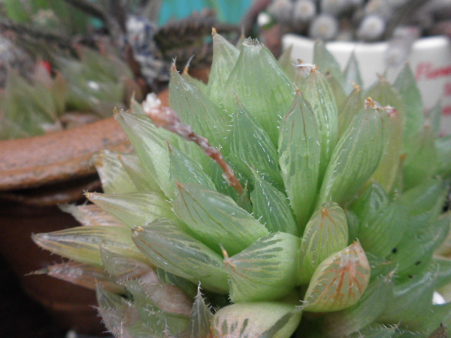 花咲いたぁ~。o@(^ゝω・)@o。ニコッ♪ちょっとピントあってないよ。゚+(σ´д`。)+゚・ 月曜日は何故かバタバタする毎週あ~一週間長いなぁ~って思ってしまう今週もがんばらなくっちゃ!! 今日は多肉いっぱいだよ♪今が一番いい季節なんかなぁプリプリだよ三ヾ(*´ω`)ノ゙ ウッヒョヒョ♪この子達は買って来たポットのまま放り込んで放置ヽ(^ω^(・xq` )ゝでもこんなに成長してメチャ元気!!雨の雫が可愛いね♪ ヨーコちゃんに貰ったタブローの多肉さん達もだいぶ落ち着いてきたから玄関にかけてみたよヽ(◎´∀`)ノ サビ缶の多肉も元気!!サビ釘刺してみた∵ゞ(´ε`●) ブハッ!! M*sちゃんに貰ったハオルチアもプクプクでおいしそう!ん?真ん中の花かな?? うぅ~~ん いい色だねぇウットリ☆:*・゚(●´∀`●)ホェ:*・゚ まだまだあるけど今日はこの辺でマタネーヾ(´∀`○人●´∀`)ノ"ByeBye