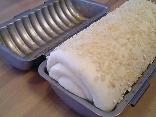 やっと満足できるものが出来て、ひとつ肩の荷が下りました。苦労した甲斐あって、とても美味しいレシピです(いつもの自画自賛!!)こんな生地を型に入れて(仕上げ発酵後です)オーブンで焼くとこんな感じ何で立ててあるか、切ったらどんな感じかは、レシピがアップされてからのお楽しみ♪蓋をして焼くタイプのパンは、生地がふんわりモッチリするので、冷めても美味しいんですね~。いつものパンと違います!カメリアの強力粉でもびっくりするほど美味しいのですよ★