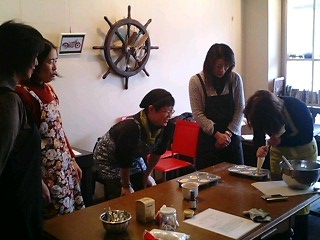 今日は楓屋さんでのてほどきの日。この前アップしたコーヒーケーキを作りました。すご~く美味しいのに超簡単なので、あっという間に出来てしまいます。せっかく来ていただいて(遠い方は多賀城から)オーブンに入れるまでに10分足らず・・・では申し訳ない気がして、計量してもらったり、クルミを刻んでもらったり、何かと時間を延ばしたりして(笑)それから、ケーキはほんのちょっとのポイントで、食感や見た目が大きく変わっていくので、レシピ本に載ってない小さなコツをお話させてもらいました。今日は楓屋さんの常連さん方で、楓屋さんで作品を展示したり、てほどきの講師をされている方々だったので、賑やかにアグレッシブな(!)雰囲気でした。試食はこんな感じ。水彩画を描かれている方が撮ってくださったので、構図が決まってますね~。何かが違います。。。お持ち帰りはこちら3つをラッピングして。皆さんきれいに包まれたので、おうちの方に作ったって信じてもらえないかも、と心配してたようです☆2月13日(水)オレンジのケーキを作ります。オレンジのスライスを乗せて、オレンジシロップを含ませたケーキです♪