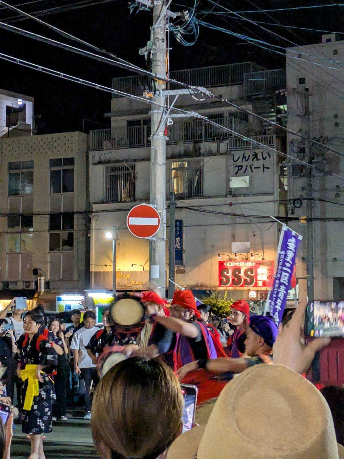 旧盆のナカビは地域でエイサーの道ジュネーがあり、いつもの呑み屋さんの真ん前で