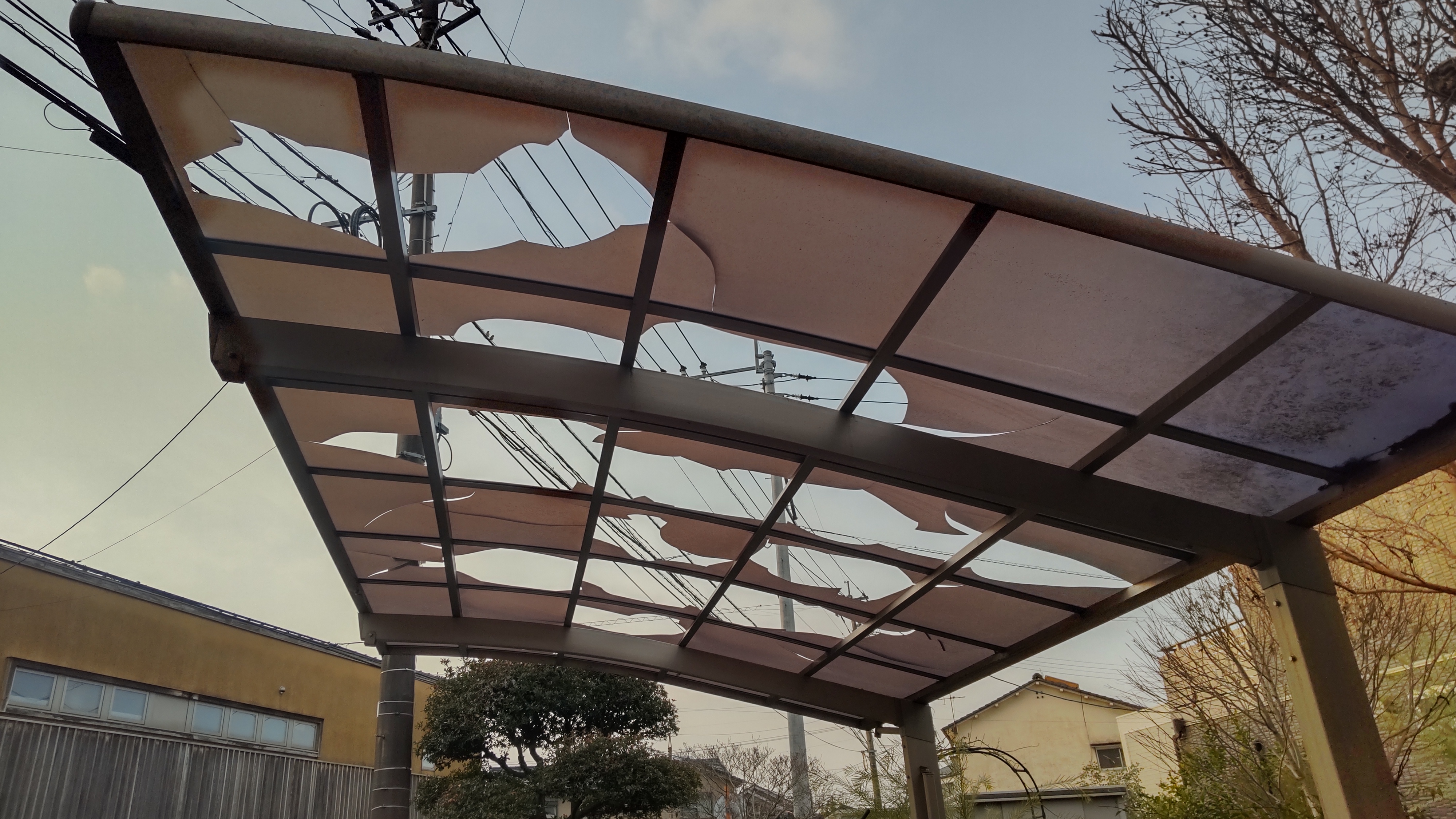 ・16年ほど前に建設したカーポートの屋根が、下記写真左のようにあちこち破れてしまい、 …