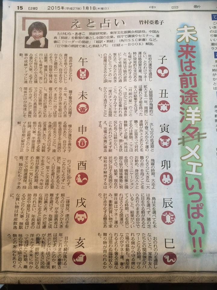 30年前に大変お世話になった方の訃報が届いた。サン・ジョルディの日の日本でのイベントを実現させようと必死だった私に「全面的に応援する!何をすればいい?」と訊ね、日本カタルーニヤ友好親善協会の理事長を引き受けてくれたN氏。元旦に亡くなられたが、メディアではまだ報じられていない。今夜のお通夜には間に合わず。明日の告別式に参じます。享年90歳、ご冥福をお祈りいたします。☆2015年元旦の中日新聞えと占い中日新聞・東京新聞のえと占い寄稿は連続31年目になる。今年のプロフィール写真はスナップである。現在の仕事を始めてからの36年間で、こんなに自然な写真をマスコミ媒体に出すのは初めて。しかもメークは普段のまま。写りは良いが普段の自分そのもので詐欺写真ではない(笑)昨年の致知出版社主催の易経講座がCDで発売されました! ☆☆来年2月開講!本格的な易経セミナー 【リーダーの易経in東京】※2015年の入門編は15期のみの開催です。超ブレイク塾主催平成27年2月から始まります!入門編15期・応用編9期(全5回)※古代人の叡智を経営に生かす内容です。※超ブレイク塾主催「リーダーの易経」は東京セミナーで、入門編・応用編ともに少人数制。経営者・後継者・企業役員・幹部候補者・キャリア対象のセミナーです。【ポッドキャスト+YouTube】「笑うビジネスマン」★デキる経営者が『易経』を学んでいる理由★ http://bit.ly/17vYJAK ☆~帝王学の書~1月3日の『易経一日一言』(致知出版社) ☆調和の要となる「礼」☆亨(こう)は嘉(か)の会なり。会を嘉(か)すればもって礼に合するに足り (文言伝)「亨」は大いに伸びること。季節でいえば百花草木が勢いよく生長する「夏」。また、「嘉」は悦び、「会」は集まる。人や物事が集まり、豊かに伸び栄えて行く。皆が悦ぶように物事を進めれば、個と全体がうまく調和し、社会が治まっていく。「礼」というと礼儀作法が頭に浮ぶが、それは小さな解釈。大きくは社会をまとめる情理・筋道、具体的には法律・秩序・制度などを表す言葉である。よろしければ応援の↓クリック↓を~(^^) ☆引用される場合は必ず引用元を明記されるよう、お願いします☆twitter & facebook 竹村亞希子 オフィシャルサイト ☆『リーダーの易経 「兆し」を察知する力をきたえる』 (角川SSC新書)¥864三省堂書店名古屋高島屋店 ☆☆NHK文化センター名古屋教室「易経」講座※広い教室に移りキャンセル待ちが解消も束の間、満席に。 さらに4席、新たに設けてもらいました。(残りわずか) キャンセル待ちのお申込みも出来ます。※易経全文を10年かけて読み込んでいます(1997年10月より)※途中受講できます。主催者:劇団レッドフェイスhttp://www.sakaki-net.com/the-redface/index.html ↓ ☆平成27年の一般の方も参加可能な「易経」講演会のお知らせ。 ※どなたでもご参加いただけます☆講演やセミナーで私が主催するものは一つもありません。 それぞれ主催者がいらっしゃいます。 申込みが不要のものもあります。※ほとんどの私の講演は、企業や官庁関係の主催のため 一般の方はお聴きいただけません。 下記は、一般の方もご参加いただけます。~~~~~~~~~~~~~~~~~~~☆NHK文化センター豊橋教室1日講座 一般の方もお聴きいただけます 平成27年2月7日(土)15:00~16:30 タイトル:【龍が教える帝王学~中国古典「易経」】 会 場 :愛知県豊橋市今橋町1-2 NHK豊橋放送会館内4F (豊橋市役所前から徒歩約3分) 0532-54-4155(要予約) 会員 2,700円 一般(入会不要) 2,916円 ※https://www.nhk-cul.co.jp/school/toyohashi/☆【長良川大学・岐阜東洋文化 共催(年4回)】平成27年2月21日(土)14時~15時30分(平成26年度) 人生に生かす易経・平成26年度 第4講義タイトル :【地天泰・天地否】 ※地天泰は上下和合、泰平の道。 ※天地否は塞がる、時代閉塞の現状。 (受付・開場は13時30分より)会 場 : 岐阜市生涯学習センター(JR岐阜駅東・三省堂書店東隣)会 費 : 1,000円(予約不要)主催・事務局 : 岐阜東洋文化振興会 ※年4回、原則第3土曜日です。※平成27年度の予定はしばらくお待ちください。☆NHK文化センター京都教室1日講座 一般の方もお聴きいただけます 平成27年3月7日(土)15:00~16:30 タイトル:【龍が教える帝王学~中国古典「易経」】 会 場 :京都市下京区四条通柳馬場西入ル 立売中之町99四条SETビル3F(烏丸から徒歩約1分) 075-254-8701(要予約) 会員 2,700円 一般(入会不要) 2,916円 ※https://www.nhk-cul.co.jp/school/kyoto/☆【盛和塾北大阪自主例会(年4回)】テーマ【天火同人・火天大有】易経講座第8回開催日:平成27年3月19日(木) 午後6:00~午後9:00(受付は5時半から) (午後7時30分頃に10分ほどのコーヒーブレイク)場 所:大阪リバーサイドホテル(JR桜ノ宮駅【西口】より徒歩2分) TEL:06-6928-3251※一般の方もオブザーバー参加できます。 (占いの講座ではありません) ご希望の方は盛和塾北大阪事務局までご連絡ください。 FAX:06-6352-7535 miyajima@taiyo-kaikei.com ↓オブザーバー会費:2,000円(当日受付でお支払ください)※平成27年度の予定3月19日、5月21日、8月27日、11月19日(すべて木曜日)☆東洋文化振興会(
