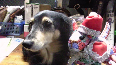 ワン嬢もクリスマス!縫いぐるみから脱着して、ワン嬢に装着できる可愛い仕立てになっています。(楽プロ、FB友のなると たると なっちゃん作&)チキン肉をたらふく食べたあとに、うつら〃zzz