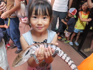 夏休み最後の思い出にと日本モンキーパークへ行ったはずが・・・おサルさんに夢中になったのもほんの一時・・・娘が気に入ったのは・・・オオトカゲ!!「可愛い~!」とナデナデ(^^;;; そして・・・イグアナ!!!これまた「可愛い~!」とナデナデ( ̄▽ ̄;;;;;パパは爬虫類が全くダメなので建物の外です。私はちょっと触るのが精一杯でした(^^;;; 息子は、お姉ちゃんが持っていたオオトカゲに驚いて「キャーーーーーーーーー!!!!!!!」と、叫びながら逃げていきました(^^;;; とても楽しく過ごせた娘でした。。。