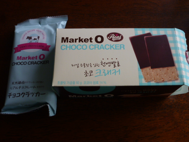 マーケットO のブラウニーを、食べた事がある方は沢山いらっしゃるでしょう。私は、マーケットOの存在をまったく知らなかったのですが、韓国へ旅行に行った友達が、お土産にマーケットOのブラウニーを買ってきてくれたのが初めてでした。パッケージがかわいいので、中身のブラウニーにも期待が高まり、いざ食べてみると結構いけるんですよ先日、スーパーに買い物へ行くと、158円でマーケットOのチョコクラッカーが売ってあり、やはりパッケージもかわいく、即買いです中には、2袋はいっていて、1袋にクラッカーが6枚入っています。クラッカーは天然酵母が使われていて、かなり薄く焼かれています。チョコは片面にしか付いていません残念まぁ一口たべてみると、クラッカーがパリッとしていて甘くなく、チョコも程よい甘さで、とっても美味しかったです試し買いで一箱しか買っていなかったので後悔次に行ったときには、もう無いかな~~ kyoko