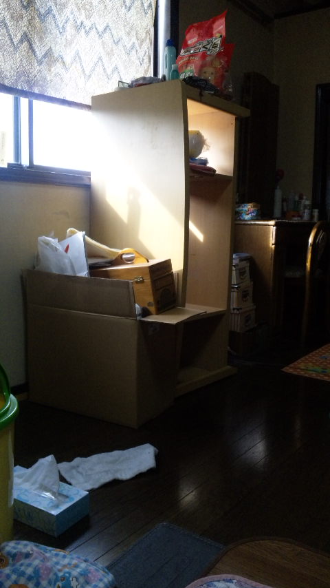 新年ブログで、今年は更新をマメにって書いたくせに・・・3月になっちゃってますね。いやはや、です。でも、これには理由が。実は実は、我が家引越しする事になりました。距離的には車で20分。お隣の市にお引越しです。お姉ちゃんちの近く、中学はこのブログにも登場する一番下の姪っ子と同じとこにです。そんなこんなで、バタバタと準備していて(言い訳?(0笑「るぅ」は三学期いっぱいは、今の小学校に通うので引越しは4月に入ってからですが、細々したにもチは自分達で運んでます。家の中は、こんな感じで足の踏み場もない感じです。引越し先のリビングです。今日もパパが帰って来たら荷物は運びに行ってきます