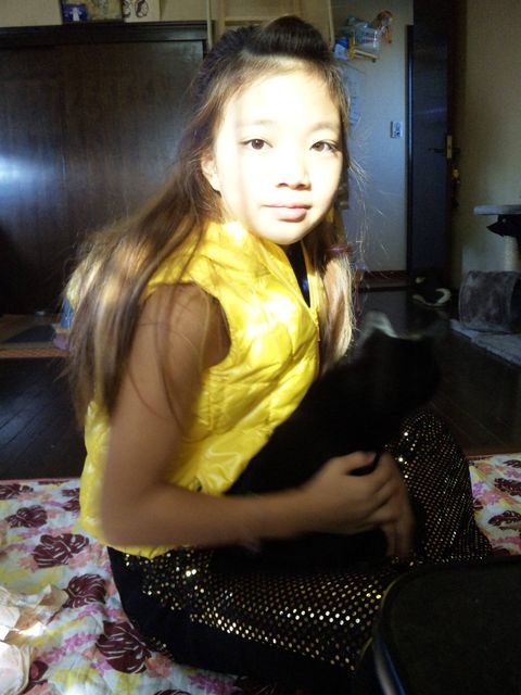 合宿が終わり、その日の晩ご飯、何が食べたいって聞いたらココスがいいって言うので寄った。いつもの、たらこスパゲティとオニオンスープを頼んで待ってる間・・・・・ ウトウト寝てしまいました。疲れてたんだね。でも、家に帰ってもらった衣装を早速つけてみると元気モリモリ。 えっと、後ろの汚い背景は見て見ぬふりで(笑合宿が終わり、「るぅ」が家で練習してるのを見てると・・・・・目つきが変った。力が入ってる。キッと何かを見つめて時には睨みつけるような目。フニャって感じが消えたかなと感じました。魂の踊り・・・・・のチームに負けない目力をつけてください。