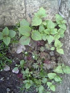 が~ん!先月買ったニオイスミレが早くも枯れてしまいました。花も咲かずに・・・。もちろんスミレの香りも匂えないまま。なんででしょう?他の鉢からはいろんなスミレの落ちばえがすくすくのびてきていて、ぽちぽち花をつけているのに。ショックです。(T_T)シクシク 春本番となってウチの庭もいろいろ出始めてきました。 まずはペンペングサ。これは抜きますが。次にはハコベ。あんまりやわらかそうなので食べてみました。ホウレンソウのような味でしたよ♪さらにクローバーとローマンカモミールがワサワサしてきました。今年はジャーマンカモミールは一株だけしか見ない・・・。車のかげはこどものせいでカラスノエンドウだらけ。 そしてなんといってもウチの庭の代表的植物(?)青じそがあらぬ所からちらほらと・・。 敷石や玄関の土台付近やあちこちから芽が出てきました。ちょっとこのまま巨大化されたら困るのも多いのでかわいそうだけど一度抜かねば。あ、でもせっかくだからもう少し大きくなってから食することにいたしましょうっと。毎年こんなにしそは出るのに、バジルは今年も芽が出ないのだろうか?毎年種を蒔くのがめんどくさいです。出ないかなあ、バジルとジャーマンカモミール。