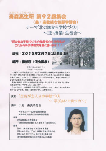 青森高生研冬の集会(第2次案内)のお知らせ冬来りなば春遠からじ。お正月は大雪の青森でしたが、ここしばらくは雪も落ち着き、春3月が待ちどおしい季節となりました。青森高生研の冬の集会は今年も、浅虫温泉帰帆荘で2月の第1週の土日である2月7日(土)、8日(日)に開催を予定しています。(東北ブロックゼミとしても行います)今回は、埼玉から小池由美子先生をお招きし、国語の授業を中心とした教育実践についてお話をいただくことになりました。また、レポート分析は大学生のときから高生研で学び、昨年より新任の教員として奮闘している先生の学級担任の実践について行う予定です。教師は最初から教師ではありません。多くの経験や学習で先生になっていくのではないでしょうか。生徒から学ぶことや、仲間とともに悩み相談していくことで私達は教師としてのボディを鍛え、生徒たちに熱い思いを伝えていくことができるのではないでしょうか。今回の集会には多くの大学生も参加を予定しています。元気と勇気をこの集会でもらって明日の教育実践の礎にしてみませんか。